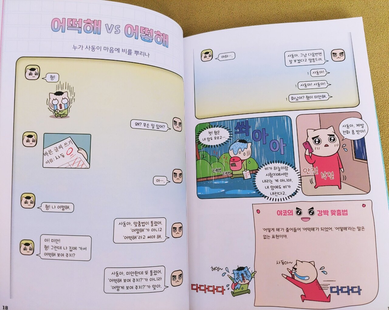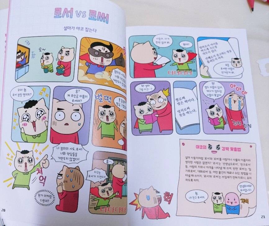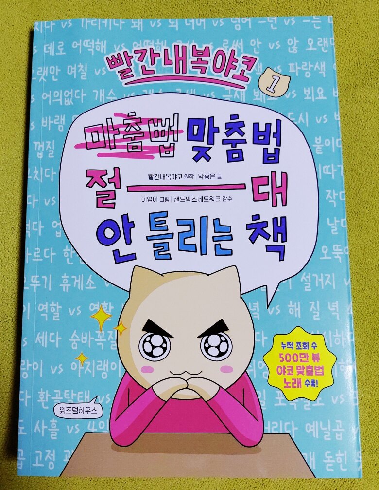 맞춤법은 글을 쓰지 않으면 덜 신경 쓰이는데 서평도 쓰고 필사도 하고 아이들과 카톡을 주고받다 보니 점점 더 신경이 쓰입니다 혹시라도 틀릴까 봐 헷갈리는 표현은 찾아보기도 하는데요 아이들도 독서보다는 스마트폰을 자주 보니 잘못된 표현을 맞는 표현으로 알고 있기도 합니다 국어 독해력 문제집을 풀다 보면 어휘력 문제가 나오는데 아직은 많이 어려운지 틀리는게 많아서 맞춤법에 많이 신경 쓰고 가르쳐줘야겠다 생각이 듭니다 저부터 안틀리고 정확한 표현을 사용하기위해 관련 책이 필요했는데 "빨간내복야코 맞춤법 절대 안 틀리는 책 "은 아이들도 재밌게 읽을 수 있는 책이라 너무 좋습니다 이 책은 귀엽고 재밌는 그림의 만화 형식입니다 단편만화를 보는 것만으로도 재밌는데 여기에 아이들이 가장 헷갈려하는 표현들만 모아 놨습니다 맞춤법에 대한 설명도 아이들 눈높이에서 이해하기 쉽게 설명이 간결하고 정확하게 되어 있어서 아이가 집중해서 읽기에 좋습니다 아이가 책을 읽으며 틀린 표현들을 손가락으로 짚으며 이야기 합니다 여기 틀렸고 여기도 틀렸고 틀린 표현을 찾으며 바르게 읽고 스스로 맞는 표현으로 바꾸면서 맞춤법에 대해 더 알고 기억하게 됩니다 캐릭터들의 표정이 웃겨서 읽는 내내 재밌습니다 평소에 저도 글쓰며 헷갈렸던 표현들이 많아서 읽으면서 배우니 도움이 많이 됩니다 어른인 저도 맞춤법 설명만 나온 책보다 빨간내복야코 가 알려주는게 더 재밌고 읽기 편하네요 아이가 앉은 자리에서 한 권을 다 읽어서 놀랐습니다 혹시나 공부라고 생각할까봐 살짝 걱정했는데 재밌다며 끝까지 다 읽었어요 아이도 헷갈렸던 표현들이 많아서 종종 불편을 느꼈는데 이렇게 알게 되서 좋다고 합니다 한 번만 읽는게 아니고 수시로 펼쳐서 찾아봅니다 이 표현이 이거었지 내가 맞았었네 그러면서 찾아보는 모습이 너무 기특하고 좋았습니다 교과서에 나오는 초등 필수 맞춤법 60가지가 수록되어 있는데 어린이들이 직접 뽑은 헷갈리는 맞춤법이라 국어 공부에 도움이 많이 됩니다 누적 조회수 500만 뷰 이상을 자랑하는 야코의 노래와 QR 코드로 만든 맞춤법 활동지까지 특별 수록하여 더욱 신나게 배울 수 있도록 했습니다 QR코드를 스캔하여 노래를 들으니 말이 굉장히 빠르네요 중독성 있는 노래인데 듣다보면 웃깁니다 한국인이 싫어하는 노래는 느려서 답답한데 가사때문에 아이들과 재밌게 들었습니다 빠른 노래는 정신없는데 아이들이 계속 듣다보니 저까지 정신없네요 아이들이 좋아하는 구성으로 국어 공부에 큰 도움을 주고 재미를 주는 책이라 추천합니다 요즘 어른들도 맞춤법 틀리고 문해력이 떨어지는 사람들이 꽤 많습니다 아이들과 함께 이 책을 읽어보시길 추천합니다