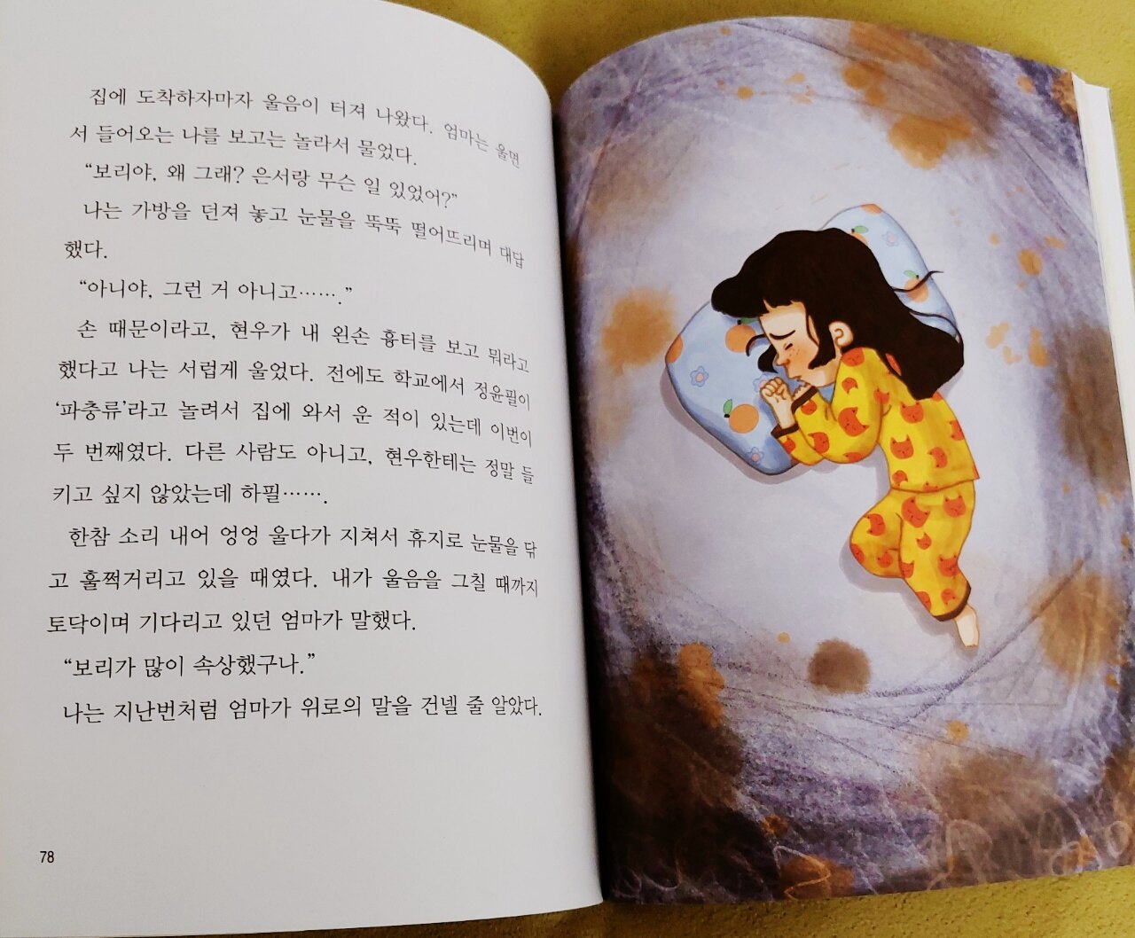 딱히 튀지 않는 평범한 학생 4학년 보리의 일상 이야기입니다 귀엽고 순수하고 가족을 사랑하는 보리와 소리의 이야기에서 따뜻함과 사랑을 느낄 수 있는데요 아이들의 속마음도 알 수 있어서 좋았습니다 별거아닌 어느 가정에서나 있는 평범한 일상 이야기인데 감동과 재미를 주는 이 책을 아이들도 공감하며 읽고 어른인 저도 읽고나서 가족들의 마음을 더 신경쓰게 되었습니다 비가 오는 날 학교로 우산을 가져다 주셨던 엄마 생각이 나면서 뭉클했습니다 항상 받기만 했던 기억뿐이라 제가 엄마에게 우산을 가져다 드린 적이 있었나 생각해보니 기억이 잘 안나네요 비가 많이 내리는 날 보리와 소리는 늦은 밤인데도 용기를 내서 엄마 아빠 구출 작전을 펼칩니다 지나가는 아저씨도 무섭고 낯선 자동차가 지나가기만 해도 겁나는 아이들인데 서로 의지하며 가는 길이 걱정되기도 하고 기특하기도 하면서 둘을 응원해 줬습니다 가족의 따뜻함을 느낄 수 있는 이야기였습니다 진순이가 젖을까봐 비가 그칠 때까지 기다려주는 아빠도 그 곁에서 온기를 나누며 등을 맞대고 있어주는 엄마도 무섭지만 용기내어 엄마 아빠에게 와 준 보리,소리를 보며 행복을 느꼈습니다 누구에게나 감추고싶은 곳이 있습니다 보리에게도 그런 곳이 있는데요 어릴 때 생긴 손등의 흉터를 다른 사람들이 볼까봐 매번 전전긍긍하며 가리기 바쁩니다 친구들이 보면 놀릴 것 같아서 항상 가리고 다녔는데 장난꾸러기 정윤필한테 하필 들키고 맙니다 정윤필의 놀림에 보리는 크게 상처를 받습니다 그 말을 들었을 때 보리가 느꼈을 속상함이 그대로 전해져 마음이 아팠습니다 상처를 가리기보다 신경쓰지 않고 당당해지는게 중요하다는걸 깨닫고 밝게 웃는 보리 기특했습니다 보리가 한층 더 멋지게 성장하는 모습이 보기 좋았습니다 매년 겨울이면 김장이 큰 행사인데요 김치 담그는 일이 너무 고되기에 집집마다 엄마들이 김장이 끝난 후 몸살이 옵니다 보리네도 김장 전투가 다가옵니다 북한에서 쓰는 김장 전투란 말에 대해 저도 배웠네요 적과 맞서 싸우는게 전투인 줄 알았는데 목적한 걸 이루기 위해서 힘을 합쳐 벌이는 노동을 말한다는 걸 알았습니다 북한에 대해 다시 생각해 봅니다 보리네 가족의 김장 전투는 작년과는 달리 화기애애 즐겁습니다 몸은 힘들지만 가족이 함께 하니 일도 빨리 끝나고 뿌듯한데요 엄마 혼자만의 일이 아닌 가족 모두의 참여가 필요하다는 걸 알려주는 이야기라 좋았습니다 이 책을 아이들과 함께 읽어보시길 추천합니다