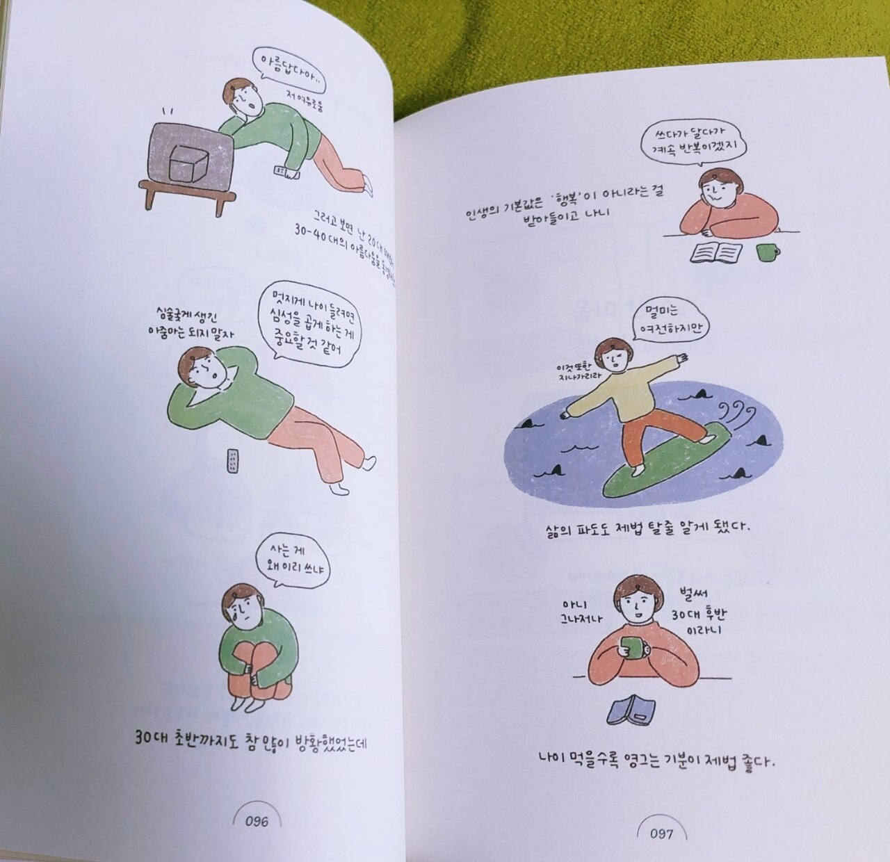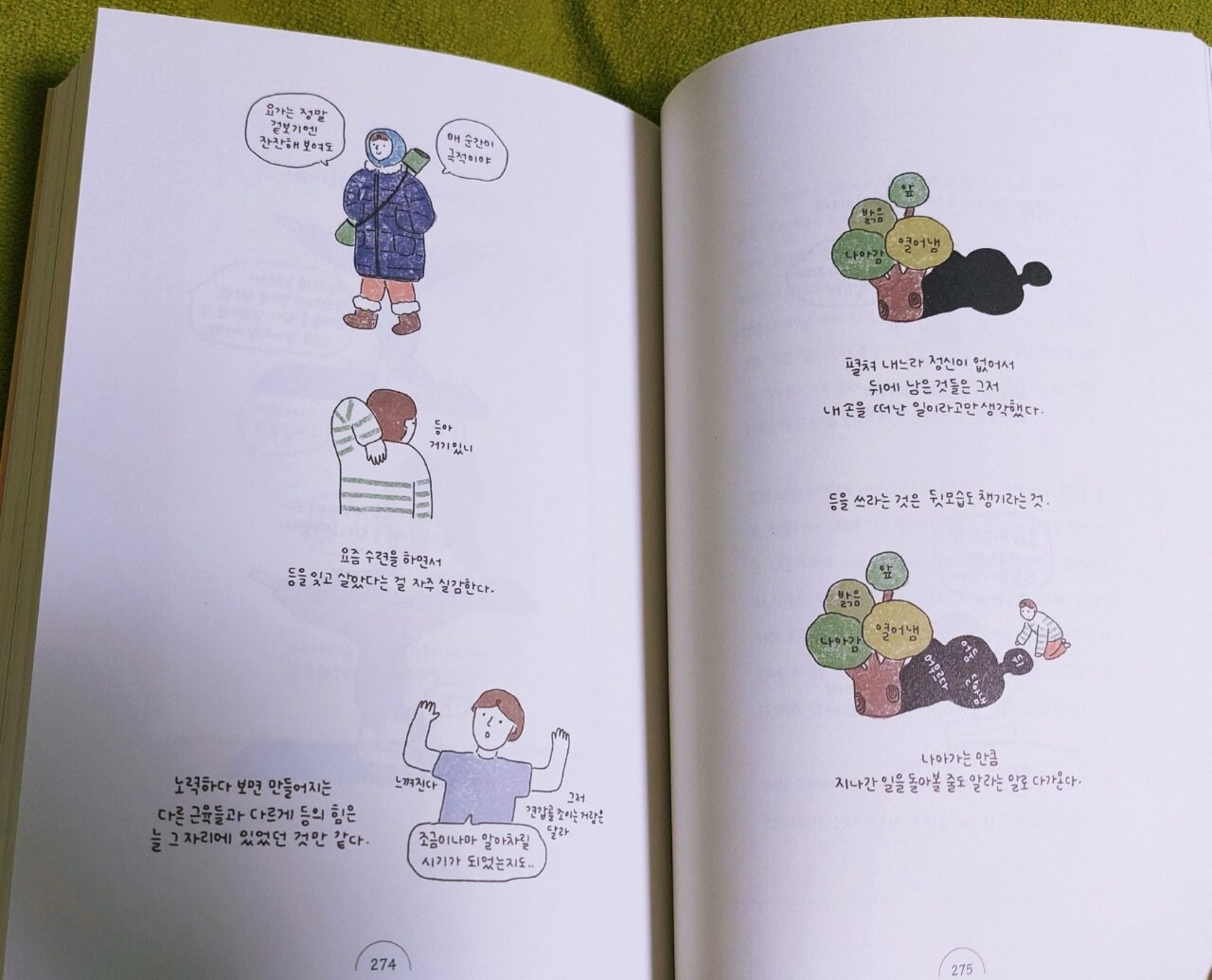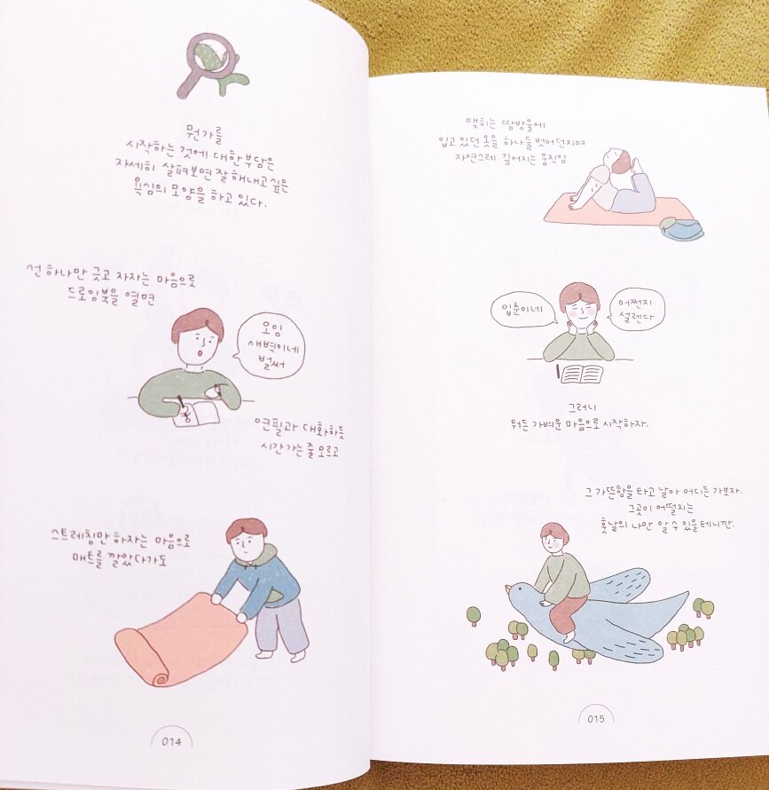 “지금 나 자신에게 만족하며 살고 있나요?” 잘 살고 있는지 스스로에게 묻고 있다면..... 책에서 하는 질문에 생각해 봅니다 다른이들이 보기에 괜찮은 삶이라 보여질 수 있겠지만 나 자신에게 묻는다면...글쎄요.. 나만 두고 본다면 저는 만족스럽지 않은 삶을 살고 있습니다 온전히 나를 위한 시간이 언제인지도 모르겠습니다 바쁘게 살아왔지만 스스로를 돌보지 못한 채 살아왔기에 그 시간들이 가엽습니다 인생의 중반에서 내 삶을 돌아보니 상처투성이입니다 나에게 상처를 준 사람들을 계속 보며 살아야한다는 것도 슬프지만 다들 그렇게 살아가겠죠.. 왜 용서와 희생에 강제성이 띠는지 묶인 관계들의 무게가 무겁기도 합니다 하지만 그 안에서 받는 것도 있으니 모순적이기도 합니다 인간에게 허락된 자유는 어디까지일까요 혼자 살아가기엔 나약한 인간이기에 관계 속에서 부딪히며 극복하고 살아가는거겠죠 관계라는게 생각이상으로 피곤한 부분이 많습니다 매일 감정소모에 시달리는 저이기에 조금이나마 위로받고자 이 책을 읽어보았습니다 그림이 편안한 느낌을 줍니다 아기자기한 그림으로 표현하는 일상은 소소하고 거창할 것 없는 날들입니다 읽는동안 마음이 편해집니다 나는 이럴 때 어떤 마음이었지 나는 다른 사람을 어떤 마음으로 바라보았지 나도 이런 말을 들었었나 애쓰며 살아왔는데 어느순간 쌓여있던게 넘치면서 갑자기 지치고 무기력해지기 시작했습니다 극복해야되는데 한없이 가라앉는 저를 보며 내 안의 저는 손을 잡아줘야될지 놔버려야될지 고민을 합니다 이대로도 괜찮겠니? 책을 읽으면 읽을수록 나도 여유있게 주변을 봐야겠다 생각이 듭니다 요가가 좋다고 들었는데 관심가지고 배워보는것도 좋을 것 같습니다 오롯이 나에게만 집중하며 건강도 챙기는 그 시간이 꽤 좋아보입니다 귀엽고 예쁜 그림을 보며 많은 생각이 듭니다 힘들 때 저를 버티게 해준건 독서였는데 역시나 이 책도 저에게 긍정적인 에너지를 줍니다 좀 더 힘내서 오늘을 잘 보내야겠습니다 마음에 평화를 주는 이 책을 읽어보시길 추천합니다 북유럽카페의 소개로 출판사로부터 도서를 제공받아 작성한 솔직 후기입니다