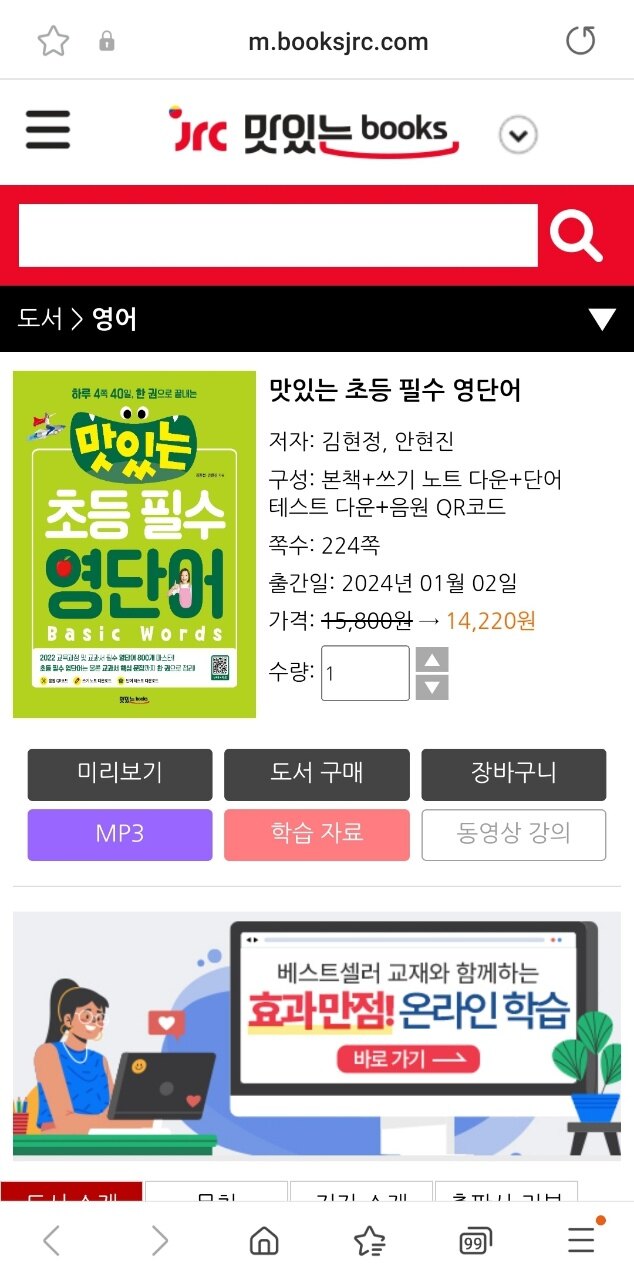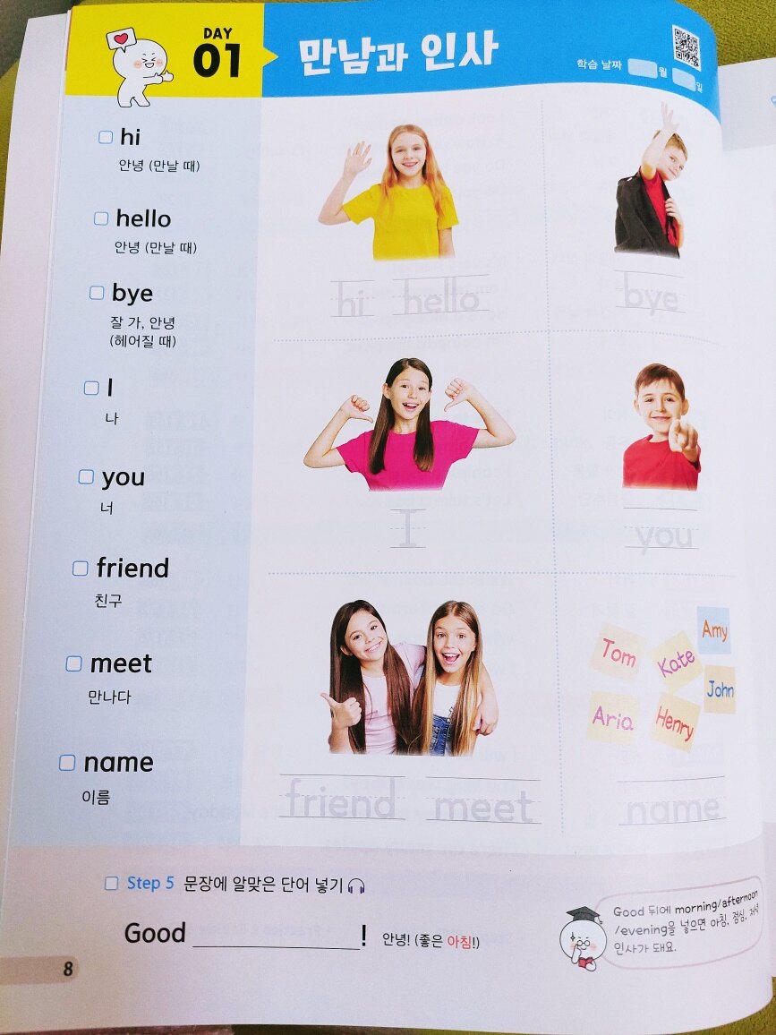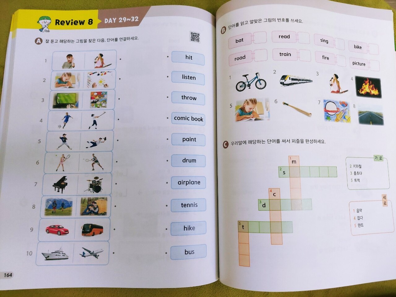 초등 필수 영단어 800개가 수록되어 있고 교과서 핵심 문장까지 한 권에 정리되어 있다니 기대가 됩니다 아이들이 영어를 배우지만 초등교과에 나오는 모든 단어를 다 아는게 아니기에 방학동안 다지고가려고 이 교재를 선택했습니다 아이가 재밌게 풀고 영어를 배우면 좋겠습니다 교재는 앞부분은 쉬운편이지만 뒤로 갈수록 난이도가 살짝 올라갑니다 처음 시작은 익숙하고 쉬운 단어들입니다 아는 단어를 체크하고 따라서 말하고 써봅니다 교재에 나오는 단어들이 아이가 알고있는거라 재밌게 풀었습니다 교재의 상단에 있는 QR코드를 스캔하면 원어민의 발음으로 영어 듣기평가를 합니다 듣고 체크하면서 발음을 따라해 봅니다 요즘 아이들은 스마트폰을 이용해 영어 공부를 하니 편리하고 다양한 정보를 통해 공부할 수 있어서 영어를 배우는데 도움이 많이 됩니다 단어를 익히고 간단한 문장을 만들어 봅니다 그림으로 나와있어서 아이들이 암기하기에 단어 연상이 잘 되고 이해도 잘 되서 훨씬 좋습니다 이 교재는 영어를 시작해서 파닉스 단계를 지나고 어느정도 익숙해진 저학년 아이들이 풀면 좋은 교재입니다 외우기만하는게 아니라 여러 방식으로 잘 이해했는지 체크할 수 있어서 재미도 있고 지루하지 않습니다 교재 구성이 매우 만족스럽습니다 색감도 예쁘고 아이들이 흥미를 가지고 볼 수 있는 다양한 그림과 구성으로 공부를 즐겁게 할 수 있습니다 책 표지의 QR코드를 스캔하여 맛있는books 홈페이지로 들어가면 다양한 자료가 있습니다 쓰기 노트와 단어테스트를 다운받아서 복습을 해봅니다 유몽한 자료들이 많고 음원도 자유롭게 들으니 초등영어 공부에 너무 좋습니다 이 책으로 아이들이 영어를 재밌게 공부했습니다 요즘 영어 교재들이 많지만 어린 아이들이 풀기에는 "맛있는 초등 필수 영단어" 가 공부하기에 좋습니다 초등영어 교재로 추천합니다