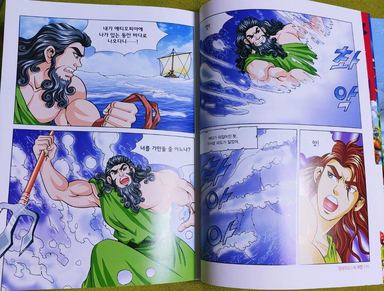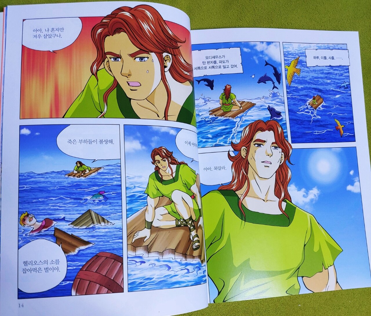 포세이돈의 방해로 오디세우스는 또 집에 돌아가지 못하고 표류합니다 보다못한 바다의 여신 "이노"의 도움으로 무사히 섬에 도착합니다 오디세우스는 포세이돈의 노여움을 사서 고생을 하지만 다른 신들의 도움을 많이 받네요 특히 아테나 여신이 오디세우스와 그의 아들 텔레마코스를 도와 위기에서 구해줍니다 오디세우스가 만나는 사람들과 이야기가 흥미롭고 재밌습니다 바다의 노인이라 불리는 프로테우스의 딸 "바다의 요정 에이도테아"가 도움을 주는데 프로테우스의 도움을 받게 해주는 방법이 인상적이었습니다 만화로 보니 더 실감나고 읽기 편해서 좋습니다 오디세우스는 많은 신들을 만나고 다양한 일을 겪으며 집으로 돌아가려고 하는데 그 과정이 흥미진진해서 몰입이 잘 됩니다 포세이돈은 끝까지 오디세우스를 방해하네요 죄없는 사람들이 바다에서 죽어가니 안타깝고 포세이돈이 밉네요 오디세우스를 도와줬다는 이유로 많은 사람들이 죽었습니다 오디세우스가 무사히 가족들 곁으로 돌아갈 수 있을까요? 아테네 여신의 도움을 받는 오디세우스니 이 고난을 잘 헤쳐나갈것이라 생각합니다 하지만 계속 꼬이네요 아버지를 믿지 못하고 칼을 겨누는 아들 앞에서 오디세우스는 오해를 풀고 자신의 정체를 알릴 수 있을까요? 19권 내용이 궁금합니다 본권과 함께 워크북이 있습니다 책의 내용을 잘 이해했는지 확인할 수 있고 문해력,독해력,어휘력이 향상됩니다 구성이 너무 좋아서 아이들에게 추천합니다 이 책을 아이들과 함께 읽고 이야기 나누니 즐겁고 유익한 시간을 보낼 수 있었습니다 출판사로부터 도서를 제공받아 작성한 솔직 후기입니다
