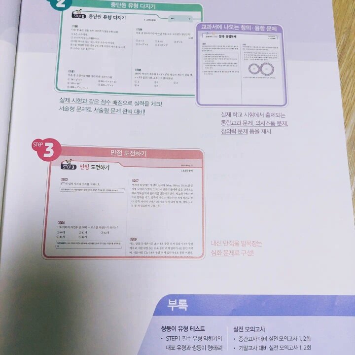 [ 개념 정리&기본 문제 다지기 교과서의 핵심 개념 및 기본 공식 등을 한눈에 정리할 수 있다. 정리한 개념을 바로 적용하여 해결할 수 있는 기본적인 문제를 수록하였다 ] 중등 수학을 잘하기위해 초등수학을 잘 다지고 고등수학을 잘하기위해 중등수학을 완벽하게 다지고 가야합니다 최종 목표는 고등수학 잘해서 수능수학 만점이 목표입니다 시중에 나와있는 수많은 수학 교재들 중에서 까다롭게 골랐습니다 천재교육은 유명하고 아이들이 많이 푸는 교재로 알고있는데 초등수학에서는 경험해보지 못했습니다 초등수학에서는 아이들이 이미 선행이 되어있어서 실력에 맞게 난이도가 높은 교재들을 선호하는데 중등선행은 기본기를 잘 다져줄 교재로 시작하고싶어서 유명한 "유형체크N제 수학 중등1-1"을 선택했습니다 중등은 초등의 연결이자 확장이지만 생소한 용어들이 나오고 부호의 변화를 잘 이해해야하기에 첫 교재가 중요합니다 아이들의 기억에 한번 들어오면 바뀌는데 시간이 걸리기때문에 처음부터 제대로된 개념을 알려주고 충분히 이해시킨후 다음 단계로 넘어가야합니다 문제집 한권 풀고 선행했다는 아이들 구멍이 정말 많습니다 수학은 개념만 잘이해하면 어떤 문제든 풀 수 있는 매력적인 과목이라 가장 좋아합니다 최상위 문제를 풀었을 때의 만족감을 아이들이 좋아하기에 기본개념 다지기를 중요하게 생각합니다 상위권을 유지하는 아이들은 다 이유가 있습니다 "유형체크N제 수학 중등1-1"의 장점은 기본 개념 정리가 잘 되어 있습니다 개념을 이해한 후 기본 문제로 잘 이해했는지 확인한 후 필수 유형을 익히는 연습을 합니다 다 맞은 후 중단원 유형으로 넘어가 문제를 풀어봅니다 문제 난이도별로 점수가 다르게 되어 있어서 실제 시험과 같이 점수를 매기고 체크할 수 있고 학교 내신과 같은 유형의 문제들로 내신 대비가 가능합니다 난이도별로 단계가 나뉘어 있어서 만족스런 교재입니다 심화 문제로 최종 확인 후 다음 단원으로 넘어가고 교재를 다 끝낸 후 잘 이해했는지 쌍둥이 유형 테스트와 실전 모의고사로 테스트합니다 잘했다싶으면 높은 난이도의 교재와 다음 선행을 같이 진행합니다 부족하다싶으면 다시 한번 다지고 넘어갑니다 아이 기본실력 체크가 되니 현재 수학 상태를 파악하는데 도움이 됩니다 저희 아이는 초등수학을 심화까지 잘 다진 아이라 재밌게 풀었습니다 틀린문제는 확인하고 넘어갔습니다 난이도가 단계별로 되어 있고 문제 자체가 좋습니다 교재를 하나하나 다 따져보고 고르는 저인데 유형체크N제 수학 중등1-1 완전 만족스럽습니다 특히 창의.융합문제가 있는게 너무 마음에 듭니다 아이가 다양한 방식으로 수학을 접근해서 풀이함으로써 사고력,문해력,이해력이 상승하므로 이런 유형의 문제를 꼭 풀리는데 이 교재에는 제가 원하는 유형의 문제들이 골고루 있어서 아이 공부에 좋은 교재입니다 왜 천재교육 수학교재가 유명한지 아이들이 많이 푸는 교재인지 알았습니다 중등은 천재교육 수학으로 내신 충분히 만점받을 수 있겠습니다 수학을 가장 좋아하고 자신있게 잘하는 아이가 이 문제집 좋다고 계속 사달라네요 겨울 방학동안 중2선행을 끝내야하기에 부지런히 공부하고 있습니다 천재교육 "유형체크N제 수학 중등"교재로 수학 배우는걸 추천합니다 수학은 어려운 과목이지만 재밌고 매력있는 과목입니다 아이들이 수학을 즐겁게 공부하길 바랍니다 특히 빠른 선행은 장단점이 있습니다 아이마다 다르기에 속도를 조절해야합니다 수학의 가장 중요한 개념을 꼼꼼히 다지기위해 이 교재를 추천합니다 아이의 실력을 판단하기에 좋은 교재입니다 #천재교육 #유형체크N제수학중등1-1#교재협찬 #중등수학문제집 #아이와함께 #홈스쿨링 #홈스쿨 #엄마표 #엄마표수학 #중등맘#중등선행#중학교수학#수학개념#중1수학문제집#중1수학#수학문제집#수학교재추천#천재교육수학