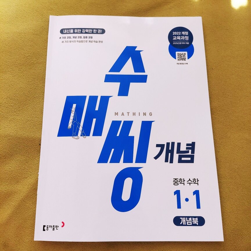 중등수학을 시작하면서 초등과는 다른 교재들로 고민이 많이 되었습니다 수학은 처음 배운 개념이 각인되어 중간에 바꾸기 힘들기때문에 처음이 중요한데요 초등 수학을 잘 마무리했다고 안심하면 안되죠 중등수학을 잘해야 고등수학을 잘할 수 있기에 신중하게 선택해야합니다 유명한 교재들이 많은데 다 풀어볼 수 없기에 몇가지 골라봤습니다 그 중에서도 동아출판 "수매씽 개념 중학수학1-1"이 맘에 들어서 신청했습니다 초등교재로는 동아출판 교재를 경험해보지 못해서 기대가 많이 되었습니다 수매씽 개념 중학수학은 개념북+워크북+정답 및 풀이 이렇게 3권으로 분리가 됩니다 한권에 다 붙어있는줄 알았는데 깔끔하게 분리가 되서 가볍고 편리합니다 교재를 펼쳐보면 소인수분해부터 좌표평면과 그래프까지 한 눈에 잘보이게 개념정리가 너무 잘 되어 있습니다 개념정리가 상세하고 세분화되어 있어서붙 아이들이 공부하기에 좋습니다 아이가 책상 벽에 붙여놓고 보겠다고해서 뒷장이 보이게 예쁘게 붙여줬습니다 초등에서 중등으로 넘어갈 때 아이들은 낯선 수학용어에 당황하고 어렵다고 생각하는데요 조금만 지나면 금방 익숙해집니다 개념이해만 확실히 하면 쉬워지는 수학이기에 첫단추를 잘 끼우면 그 다음부터는 최상위 문제도 술술 풀 수 있습니다 수매씽 개념 중등수학 1-1 개념북은 아이들이 중등수학의 기본을 다지기에 좋은 교재입니다 선행을 하거나 개념을 탄탄하게 다지기에 좋기에 중등 첫교재로 만족스럽습니다 문제를 난이도별로 나눠놓은걸 선호하는데 수매씽 개념은 개념 완성하기,실력 확인하기,서술형 문제,실전!중단원 마무리,교과서에서 쏙 빼온 문제로 난이도와 문제 구성별로 분류하여 아이가 어느부분이 약한지 파악할 수 있게 도와줍니다 다음은 수매씽 개념 중등수학 1-1 워크북입니다 개념북에서 배우고 연습한 내용을 한번 더 확인하며 실력을 다지기에 좋습니다 아이마다 다르겠지만 저희 아이들은 두껍고 문제수만 많은 교재는 비효율적이라 피하는편인데 수매씽은 제가 원하는 스타일의 교재라 매우 만족스러웠습니다 기본에 많은 시간을 보내는것보다 기본을 제대로 다지고 난이도 높은 교재를 풀리면 잘 이해했는지 어디가 부족한지 체크하기에 좋기에 꼼꼼히 확인하며 공부시키고 있습니다 "수매씽 개념 중등수학"은 2022년 개정 교육과정을 완벽 반영했으며 교과서 집필 노하우가 반영되어 개정 방향을 완벽 적용했습니다 교재 표지의 QR코드를 스캔하면 개념 동영상 강의를 제공해주기에 혼자 공부하는 아이들에게 큰 도움이 됩니다 학원을 다니지않고 혼자 공부하다보면 이런 강의가 너무나 도움이 되기에 혼공 아이들이 걱정없이 풀 수 있습니다 든든한 선생님입니다 예습,복습으로 너무 좋은 중등수학 문제집으로 "수매씽 개념 중등수학"을 추천합니다 이 포스팅은 동아출판의 도서를 제공받아 작성한 개인적인 후기입니다