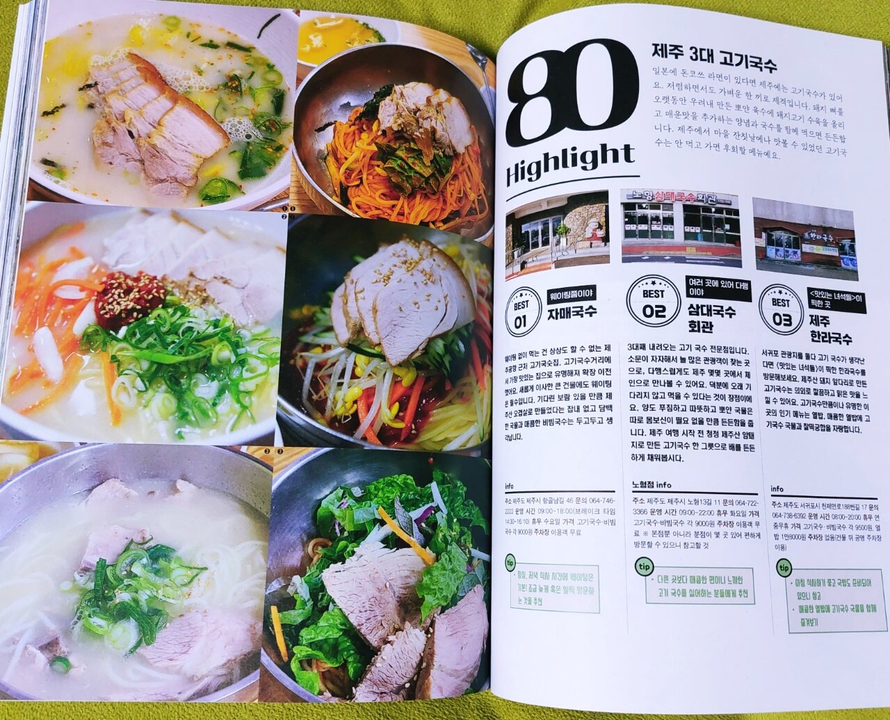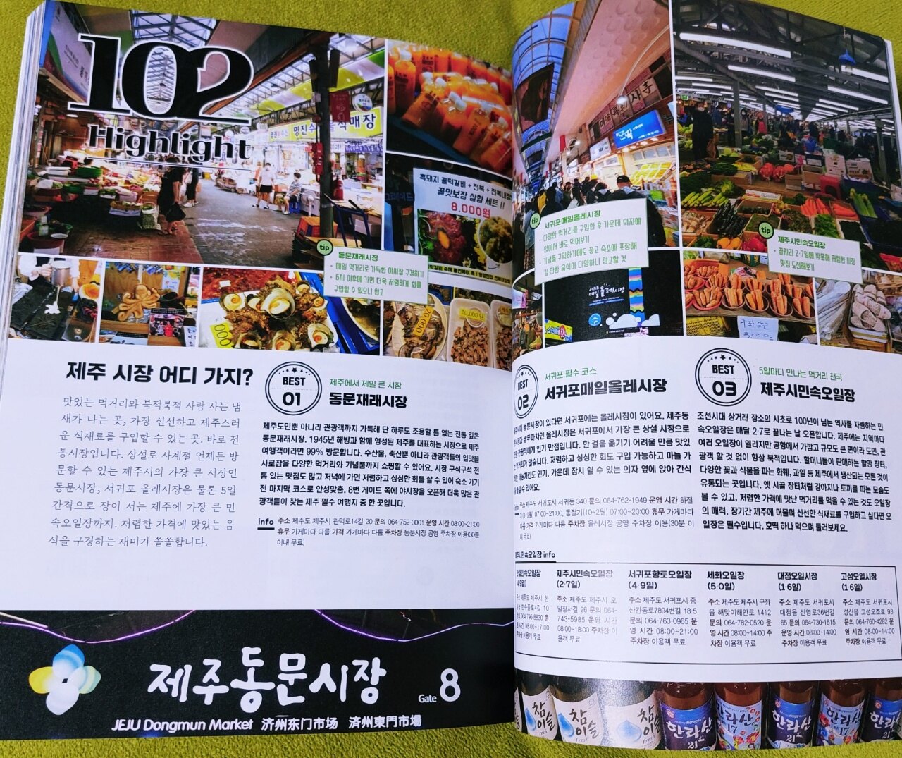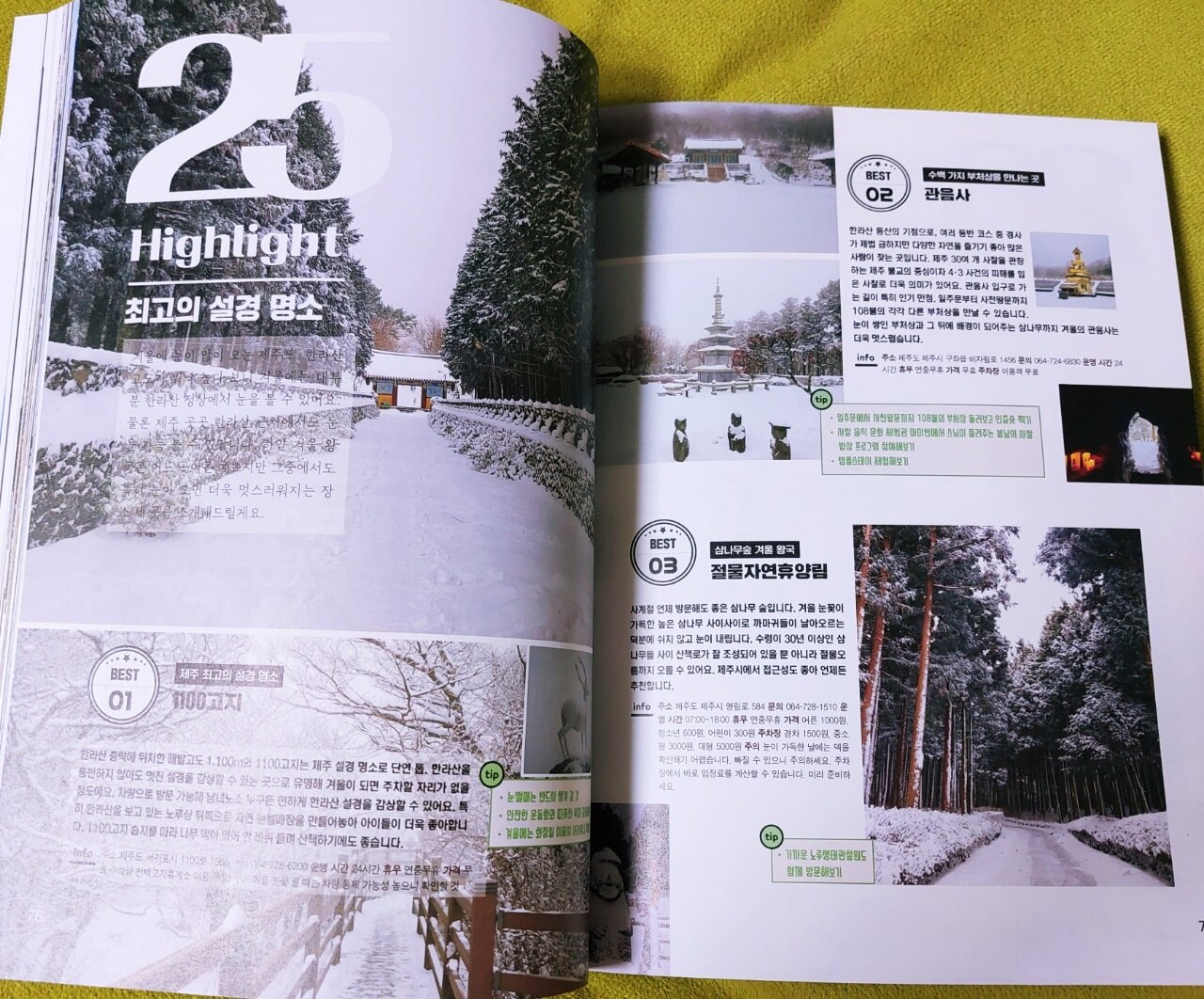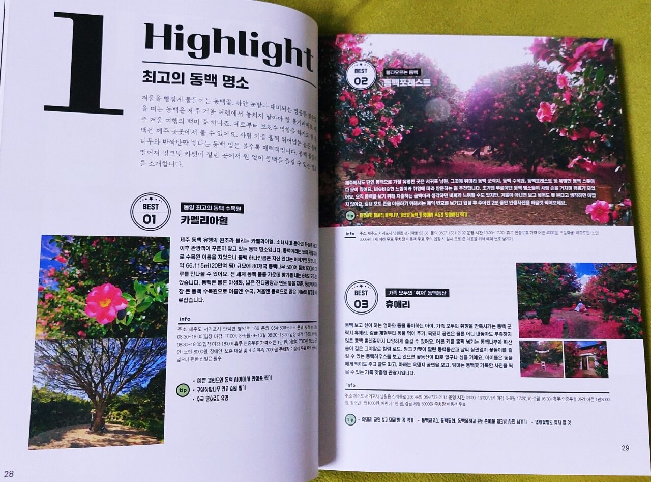 표지부터 제주의 풍경이 너무나 예쁜 "하이라이트 제주" 여행가이드북입니다 제주는 가깝지만 자주 가기는 힘든 곳인데요 한번 맘 먹고 가면 어디부터 가야될지 어디가 좋은지 검색만 하다가 시간이 갑니다 후기도 제각각이라 찾고 고르다보면 계획대로 흘러가지않고 결국 가고자 마음먹은 곳을 다 못가고 시간에 쫒기게 됩니다 위치나 거리도 잘 계산해서 다녀야 정해진 시간에 보다 많은 곳을 갈 수 있기에 여행가이드북은 필수입니다 서점에 나온 여행가이드북이 많은데 "제주,하이라이트"는 다른 책들과는 차별화되고 구성이 더 좋아보이기에 선택했습니다 받기전부터 매우 기대가 되었고 받았을 때 정말 좋았습니다 Photo zone 가시리부터 송당리 메밀꽃밭까지 제주의 아름다운 풍경을 한데 모아 놓았습니다 포토존으로 유명한 곳들인데 사진만 봐도 가고싶고 설레입니다 동화 속에 들어온듯하고 너무 멋지네요 책은 시작부분에 새롭게 달라진 제주 정보를 알려줍니다 단순한 여행지 소개가 아니라 제주를 더 잘 이해하고 미리 알고 가야할 소식들을 알려주니 뭔가 더 특별한 느낌을 줍니다 제주도 배달 앱은 '먹깨비'도 있다니 재밌네요 또 제주 마트에서는 종이 박스를 제공하지않는다니 꼭 장바구니를 챙겨가야겠습니다 종량제봉투는 제주에서만 사용할 수 있으니 부피가 작고 주머니에 들어가는 휴대용 장바구니를 챙기는게 더 좋을 것 같습니다 미리 알고 갈 유용한 정보가 도움이 됩니다 제주의 역사를 소개해주는 것도 인상깊었습니다 제주를 이해하고 몰랐던 사실을 배우는 좋은 시간이었습니다 한장한장 그냥 넘어가는 페이지가 없습니다 읽을수록 재밌고 유익한 내용들로 가득합니다 나에게 맞는 제주 여행 테스트 11을 하나씩 다 해봤는데요 생각보다 재밌고 결과가 만족스럽습니다 사다리게임이 신선하네요 액티비티는 카트,핑크는 핑크뮬리,소금빵은 김녕빵집 등등 가볼 곳이 늘었습니다 이 책은 페이지 넘길 때마다 기대이상입니다 다음은 MBTI에 맞춘 제주 여행 코스입니다 식구들이 다 다르니 저한테 맞추겠습니다 그런데 섬이네요... 아이들한테 맞추니 더 난것같습니다 ㅎㅎ 책에서 첫번째로 보여주는 명소는 최고의 동백 명소입니다 와~~동백꽃이 이렇게 한가득인 곳은 처음 보는 것 같습니다 너무 예뻐서 깜짝 놀랐습니다 겨울에 제주도 가면 꼭 가봐야겠습니다 동화 속 공주님이 된 것 같고 환상적이네요 넘길 때마다 꽃이 가득인 곳들이 차례로 소개되는데 꼭 보세요~~ 구매해서 소장하셔야 합니다 제주도하면 한라산을 빼놓을 수 없죠 최고의 설경 명소인데요 설경이 너무 멋져서 한참 쳐다봤습니다 겨울의 제주도는 매력이 넘치네요 유채꽃 피는 봄에만 갈 생각했지 겨울이 이렇게 멋질줄이야 사진들마다 정말 멋지네요 제주도에는 맛집들도 많습니다 인기있었던 우영우 드라마에서 고기국수가 나왔죠 제주도 가면 꼭 먹어야지했는데 사진부터 먹음직스럽습니다 책에서 소개해주는 맛집들도 꼼꼼히 체크해서 가고싶은 곳들을 메모했습니다 가고싶은 곳이 많습니다 다 맛있어 보입니다~ "제주,하이라이트"에는 제주도의 모든 것이 담겨있습니다 유명한 장소부터 이색적인 장소까지 구석구석 다 보여주는데 책만 봐도 구경하는 재미가 있습니다 여행가이드북을 이렇게 즐겁게 오래 읽다니 너무 좋았습니다 제주가 궁금하신분들, 제주도에 여행 갈 계획이신분들,멋진 사진 보는걸 좋아하시는분들 모두에게 강추합니다 이 책을 읽어보시길 추천합니다 펼치는순간 만족하실겁니다