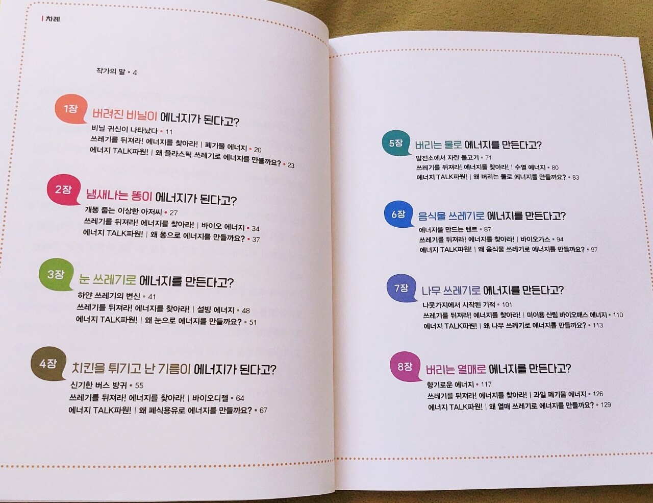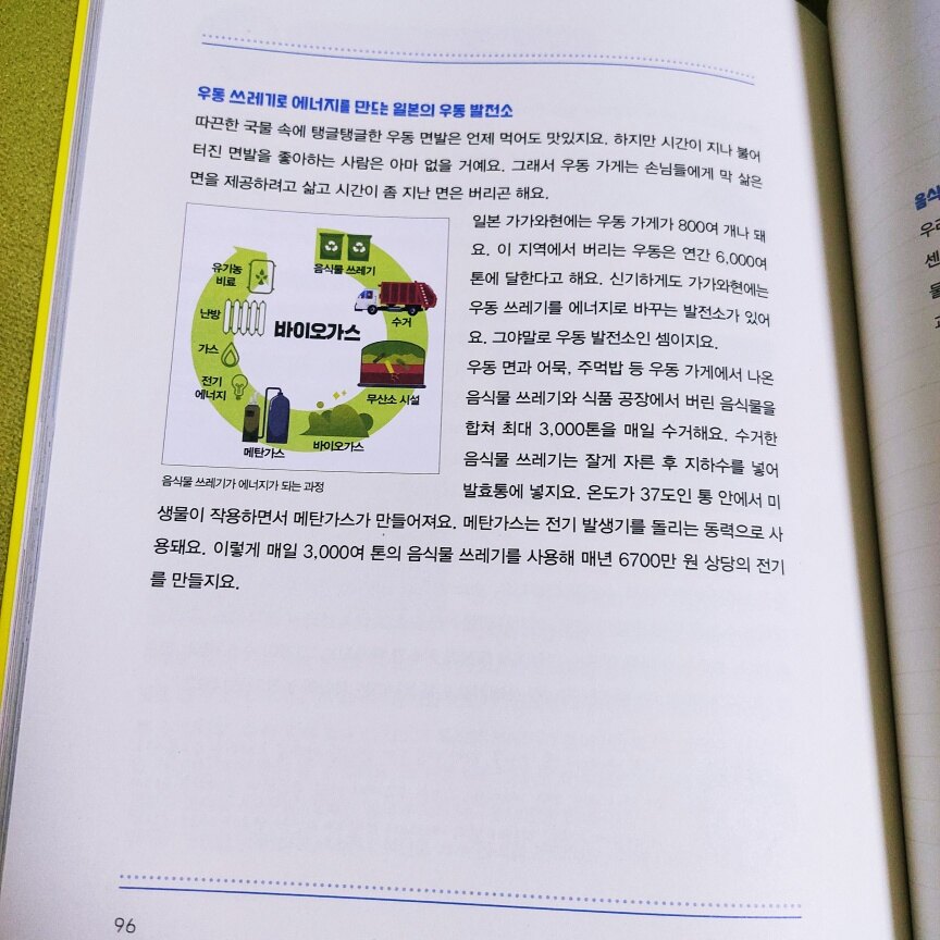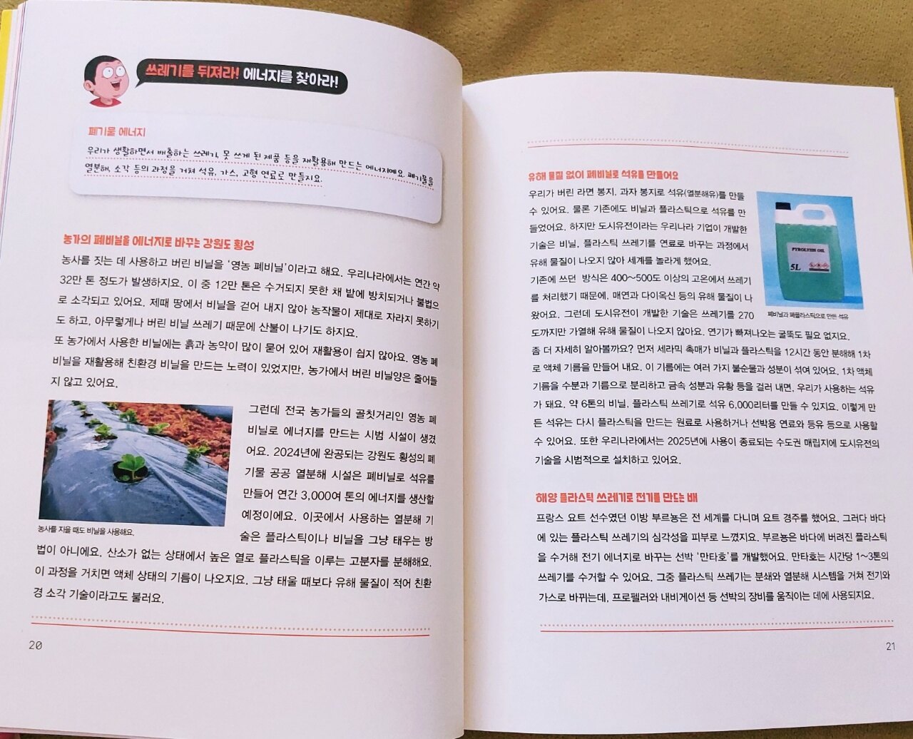 지구를 오염시키고 처리가 골치 아픈 쓰레기는 인류의 최대 고민거리입니다 편리한 생활을 위해 사용하는 일회용품 쓰레기는 재활용도 안되고 자연 분해도 안되서 소각해야하는데 비용이 많이 들고 그 과정에서 나오는 유독가스로 공기오염도 발생합니다 쓰레기가 늘어나는 가장 큰 원인 중 하나는 제대로된 분리배출이 안되는겁니다 재활용 쓰레기를 구분해서 버리고 재사용할 수 있는 대체물질로 생산할 수 있도록 깨끗한 상태로 버려야하는데 지켜지지않고 있습니다 요즘은 전보다 나아졌지만 여전히 마구버려대는 쓰레기로 문제가 심각합니다 이 책을 통해 아이들이 자연을 더 소중히여기고 쓰레기가 자원으로 재활용 되어 에너지로 쓰인다는걸 알고 분리배출도 잘하고 일회용도 안쓰는 그런 아이들이 되었음 좋겠습니다 물론 부모들이 모범을 보이고 실천하는 모습을 보여줘야겠지요 아이들이 읽기 편하고 좋아하는 만화로 되어 있어서 재밌게 읽을 수 있습니다 과자봉지가 석유로 만들어진거였다니 신기해합니다 과자봉지는 재활용이 안되는 쓰레기인줄 알았는데 석유 에너지가 될 수 있다니 분리배출을 잘해야겠습니다 동화를 읽듯이 재미난 이야기 형식으로 자연스럽게 에너지에대해 배울 수 있습니다 쓰레기 소각장이 공기오염을 시키는줄 알았는데 이젠 열분해라는 신기술로 탄소 배출도 줄이면서 에너지를 만든다고하네요 쓰레기를 줍는게 아니라 석유자원을 캐낸다는 동규의 말이 재밌습니다 생각해보면 곳곳에 있는 쓰레기들이 중요한 자원이었네요 버려지는 엄청난 양의 플라스틱이 환경 오염의 주범이었는데 이젠 기술의 발달로 폐플라스틱 17톤으로 수소 2톤을 만들 수 있다니 굉장하네요 우동쓰레기로 에너지를 만드는 우동발전소 이야기도 인상깊었습니다 매일 3,000여 톤의 음식물 쓰레기로 매년 6700만원 상당의 전기를 만든다니 음식물 쓰레기도 분리배출을 잘해야겠습니다 책에 나오는 이야기들이 다 흥미롭습니다 쓰레기를 에너지로 재활용하는것은 인류의 미래를 위해 반드시 필요합니다 우리 모두가 올바르게 알고 가정에서부터 분리배출,일회용 줄이기,전기와 물같은 자원 아끼기 등 다함께 실천해야합니다 저도 책을 통해 에너지를 어떻게 만드는지 많은 것을 배웠습니다 아이들의 미래가 더 나은 세상이길바라며 이 책을 아이들과 함께 읽어보시길 추천합니다 출판사로부터 도서를 제공받아 작성한 솔직 후기입니다