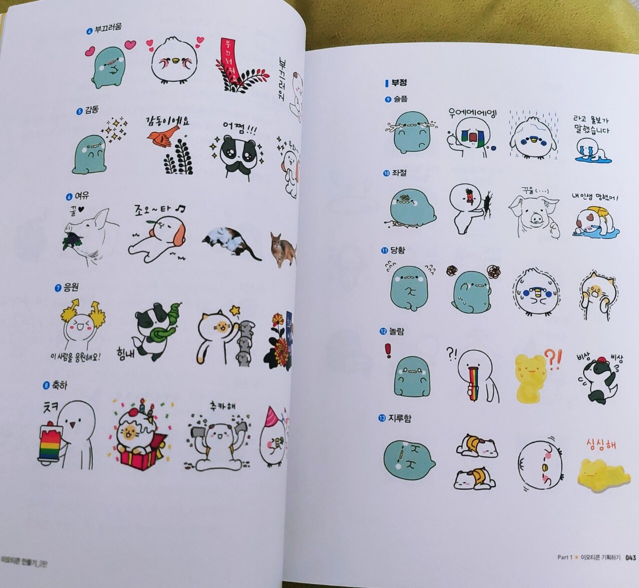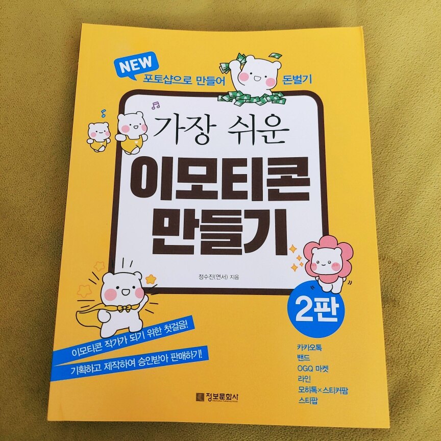 카카오톡,인터넷 카페,블로그,인스타그램 등등 우리가 사용하는 것들에 이모티콘은 필수인데요 자신의 감정이나 상황을 문자로만 주고받다보면 오해도 생기고 제대로된 전달이 안되기도 합니다 그래서 이모티콘으로 보완하는데요 꽤 효과가 좋아서 이모티콘은 인기가 많습니다 넘쳐나는 이모티콘들은 굉장히 다양합니다 사람들의 창의력이 돋보이는 이모티콘은 직접 제작해서 등록까지 되야하는데요 등록 되는게 어렵습니다 만들고자하는 마음도 중요하지만 만드는 방법을 제대로 알고 배워야 하기에 준비가 필요합니다 저같은 초보도 만들 수 있도록 도와주는 이 책이 꼭 읽어보고싶었습니다 이모티콘 작가라는 직업이 생겼습니다 억대 매출인 사람들의 기사가 나오고 너도나도 뛰어든 이모티콘 제작에 매일 수많은 이모티콘이 생겨납니다 상품가치가 있고 수익이 보장되려면 꽤 어렵지만 꾸준히 노력한다면 좋은 결과가 오지않을까요 책을 보니 설명이 정말 잘되어있습니다 이모티콘 만드는 방법이 순서대로 잘 나와있어서 보고 따라하기가 편합니다 제일 먼저 해야할 일은 이모티콘을 어떤걸 만들지 잘생각해서 정하는겁니다 내가 표현하고자하는 상황과 스타일,내용을 정하고 기획한 후 캐릭터를 그려봅니다 책은 이모티콘 작업에 필요한 포토샵 기능부터 움직이는 이모티콘 모션 프레임까지 차근차근 설명해줍니다 이렇게 정성들여 만들어진 이모티콘은 카카오톡 외에도 여러 플랫폼을 통해 판매가 가능합니다 승인 받기가 까다롭고 힘들다고하니 안됐다고 좌절하거나 포기하지말고 다시 도전해봅니다 책은 이모티콘 제작 외에도 판매승인을 받기위해 필요한 제안서 작성 방법과 심사과정이 어떻게 되는지 알려줍니다 막막하기만했던 이모티콘 제작을 이렇게 책으로 보고나니 희망이 생깁니다 많은 도움이 된 이 책을 꼭 읽어보시길 추천합니다 도전은 멋집니다~~~!!! 출판사로부터 도서를 제공받아 작성한 솔직 후기입니다