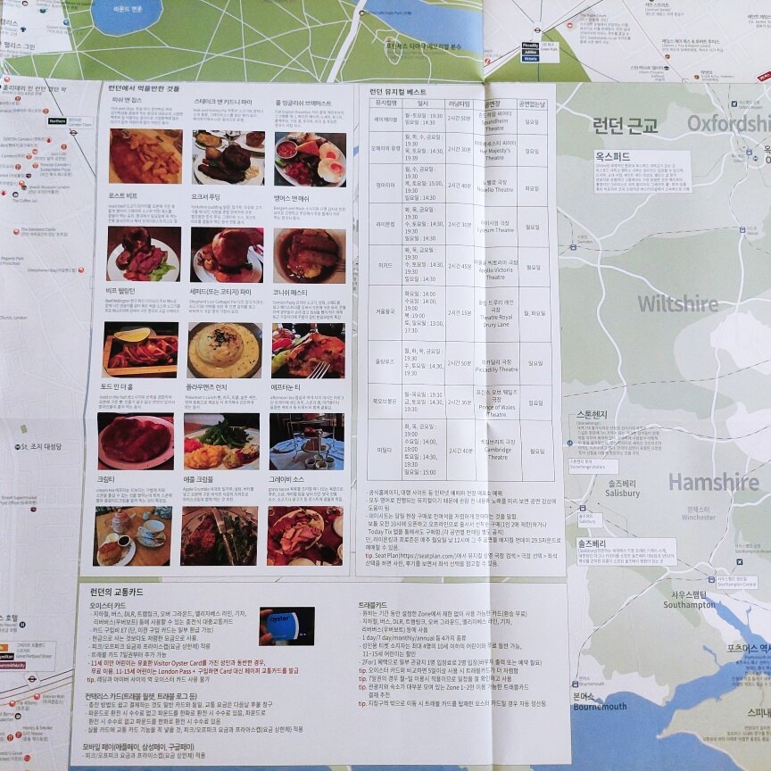 이 지도는 다른 한장의 지도보다 조금 더 상세하게 표시되어 가고자하는 지역의 위치를 더 자세히 알 수 있고 맛집과 런던의 교통카드,뮤지컬에대한 정보까지 나와있어서 유용합니다