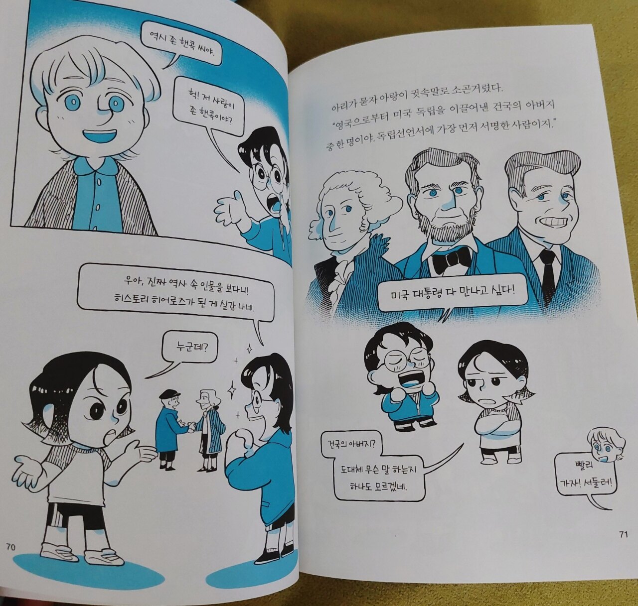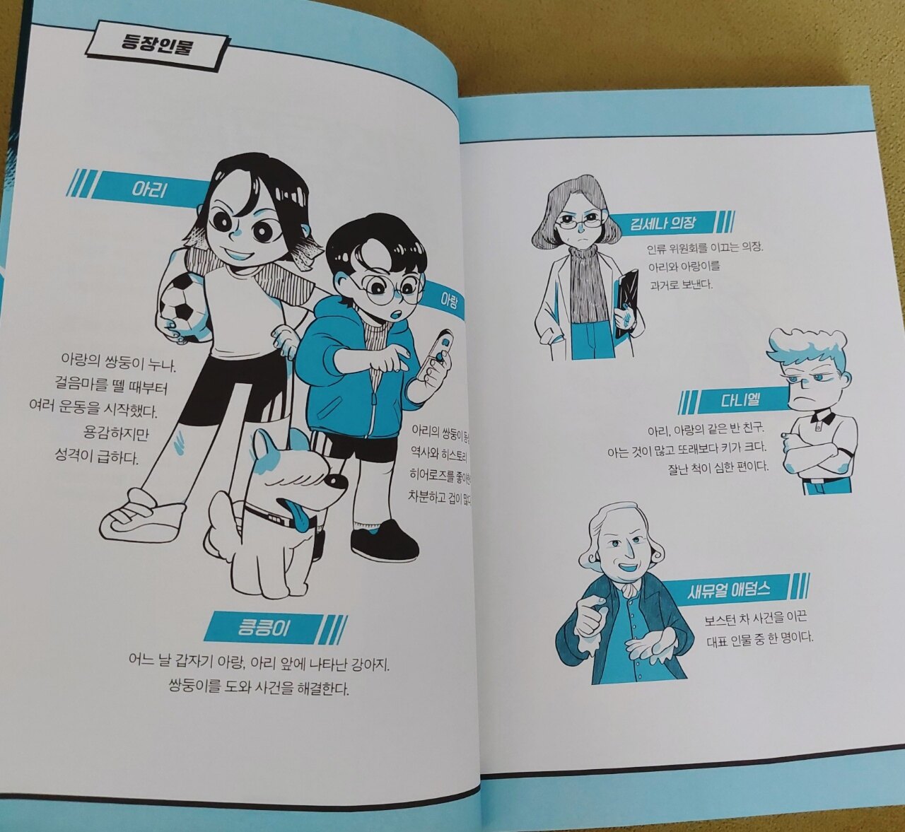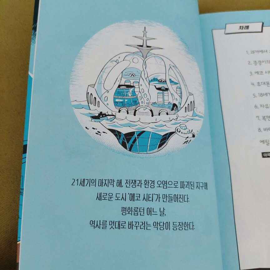 한국사,세계사가 어려운 아이들에게 쉽고 재미있게 접근할 수 있는 이 책은 그림과 함께 있기에 읽기가 참 좋습니다 역사라는 말만 들어도 아이들 표정에서 거부감이 보이는데요 히스토리 히어로즈는 아이가 읽어보고싶다며 직접 고른 책입니다 미국에서 실제 있었던 사건 "보스턴 차 사건"을 어떴게 이야기해줄지 기대가 되었습니다 주인공은 아리와 아랑이 쌍둥이 남매입니다 친환경 도시 에코 시티에 살고 있습니다 씩씩하고 용감한 아리와 똑똑하고 역사를 좋아하는 아랑이는 어느날 갑자기 만난 킁킁이와 킁킁이가 가지고 있던 물건을 얻게 되면서 둘의 모험이 시작됩니다 그림이 있으니 긴박한 상황이 더 실감나고 아이들 투닥거리는 장면도 재밌습니다 초창기 히스토리 히어로즈의 멤버였다가 악당이 된 타임X가 과거에서 폭탄을 보내 타임 키핑 존에서부터 폭발이 시작되고 비상사태에 돌입합니다 오래된 타임머신을 움직일 방법은 타임 폰인데요 유전자 인식이 된 사람만 가능하고 사용자 변경은 불가능합니다 타임 폰의 선택을 받은 아리와 아랑이는 히스토리 히어로즈가 되어 과거로 떠나게 됩니다 흥미진진한데요 ~ 아리와 아랑이가 간 곳은 어느 시대일까요? 18세기 미국 보스턴으로 가게 된 아리와 아랑이는 역사 속 실제 인물을 만나고 과거를 지키기위해 고군분투 합니다 둘의 활약으로 고비를 넘기고 돌아오려고하는데요 갑자기 큰일이 발생합니다 "쩌저적 쩌억~~안돼~~~~" 헛...무슨 일일까요?둘은 무사히 돌아올 수 있을까요? 2권으로 이어집니다~~~~ 너무너무 궁금해요~~~ 빨리 히스토리 히어로즈 2권이 나오면 좋겠습니다 책과 함께 온 세계 지도에는 18세기 주요 세계사가 한눈에 보입니다 덕분에 아이들과 각각의 사건을 찾아보고 이야기 나눴는데요 세계사 공부도하고 저도 같이 배웠습니다 과거로 간다는 설정이 흥미롭고 실제 역사를 아이들 눈높이에서 이해하기 쉽고 재밌게 설명해줘서 좋았습니다 세계사가 어렵다던 아이도 미국의 역사를 배웠다고 관심을 갖기 시작했습니다 히스토리 히어로즈가 되어 사라진 역사를 발견하고싶다는 아이에게 역사를 좀 더 알면 될 수 있다고 말해줬답니다 아이들과 즐겁게 읽고 역사를 배워서 유익한 시간이었습니다 이 책을 읽어보시길 추천합니다 [출판사로부터 도서 협찬을 받았고 본인의 주관적인 견해에 의하여 작성함]