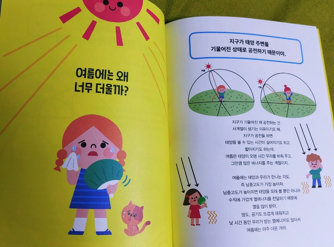 아이들은 항상 언제 어디서나 호기심이 많고 궁금한건 못참고 질문을 많이 합니다 계속 이야기하고 의문을 품고 이해하며 배우고 성장하는데요 아이들의 호기심은 어른들이 귀기울여 들어주고 함께 이야기 나누고 올바른 지식을 전달해줘야 아이들도 바른 아이로 성장하고 발전합니다 질문이 많고 해줘야되는 이야기가 많아진다고 귀찮게 생각하면 아이들은 배울수가 없습니다 꼭 잘 들어주고 정확한 정보를 전달해 줘야해요 아이들이 자라서 세상을 변화시키고 멋진 미래를 만들어가기에 우린 아이들에게 많은 것을 알려주어야 합니다 아이들은 희망이고 기적이니까요 우리 아이들이 많이 하는 질문에 사계절이 있습니다 아이들 질문이 쉬워보여도 대답해주다 보면 어렵고 막힐 때가 있는데요 과학적 지식으로 알고있는걸 아이들 눈높이로 설명하기가 난감하기도하고 어른들도 정확히 몰라서 대답을 못해주기도 합니다 그럴때 이 책은 정말 필요한 책인데요 아이들이 했던 질문들이 다 있습니다 우리나라가 사계절인 이유를 과학적으로 설명해주고 환경 오염으로 사계절이 변할수도 있다고 알려줍니다 봄,여름,가을,겨울마다 특징들을 예쁘고 귀여운 그림과 함께 아이들이 알기 쉽게 설명해줍니다 책을 읽으며 저도 많이 배웠는데요 설명해주기 어려웠었던걸 와~~이렇게 과학 지식을 이용해서 이야기해주는데도 아이는 이해를 바로 합니다 설명이 길지도 않고 핵심만 잘 요약해서 정보 전달이 간결하고 정확합니다 궁금한 어린이를 위한 질문과 답이 30가지나 있어요 아이들이 이 책을 읽으면 과학 박사,상식 박사가 되겠어요~ 아이들과 함께 어른들도 꼭 읽어보시길 추천합니다 출판사로부터 도서 협찬을 받았고 본인의 주관적인 견해에 의하여 작성하였습니다