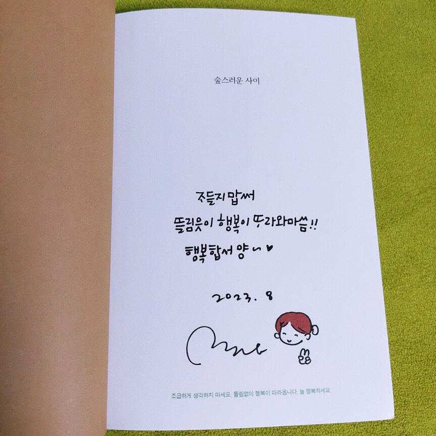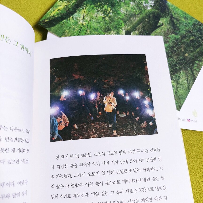 마음의 여유가 필요하고 힐링을 원하는 저에게 너무나 보고싶은 책이기에 선택했습니다 숲이 주는 안정감,따뜻함,싱그러움,시원함,고요한 동시에 숲에서 나는 살아있는 소리들.. 이 모든게 생각만으로도 감동을 주는 숲은 사람이 살아가는데 반드시 필요한 고마운 존재인데요 "제주 환상숲 숲지기 딸이 들려주는 숲과 사람 이야기" 너무나 기대가 되었습니다 책은 표지부터 생동감이 넘치고 푸르른 숲이 주는 즐거움이 저자의 표정에서 느껴집니다 너무나 예쁘게 웃고 계셔서 보는 사람도 같이 미소가 지어집니다초판본에는 저자의 사인이 인쇄 되어 있고 숲의 싱그러움을 보여주는 엽서 3장이 같이 들어 있습니다 책에 실린 사진이라 엽서도 의미가 있습니다 소장하시는분들 꼭 초판본 사세요~~ "조급하게 생각하지 마세요.틀림없이 행복이 따라옵니다.늘 행복하세요." 저자는 제주 환상숲곶자왈공원에서 12년째 숲 해설을 하고 있습니다 매일 숲을 다니며 사람들에게 숲을 이야기해주는 숲해설사라니 생소하여 찾아보니 전문자격증을 필요로하는 산림교육전문가네요 이렇게 또 배웁니다 저자가 만난 사람들의 이야기를 읽으니 즐겁습니다 제가 그곳에 있는것처럼 느껴집니다 다양한 사람들을 만나며 느낀 저자의 감정들이 고스란히 전해지는데요 일본어 선생님과 96세의 멋진 할머니의 이야기에서는 감동을 받았습니다 나이드는걸 싫다고만 생각하고 슬프기도 했는데 생각이 바뀌네요 나도 저렇게 멋진 할머니가 되어야겠다 생각하니 더 열심히 살아야겠다 반성하게 됩니다 저자가 만난 사람들에게서 저도 같이 공감하고 배웁니다 글이 매끄럽고 전달이 잘되서 읽는내내 즐겁습니다 저자의 남편도 숲해설가네요 같은 직업이면서 결이 다른 해설로 라이벌 관계이기도하다는 두분은 반대의 성향이지만 서로의 장점을 알고 존중해주고 칭찬해주는 그 모습이 너무 멋집니다 "있는 그대로의 모습을 품어주는 것만으로도 누군가에게는 큰 위안이 될 때가 있다" 책에 있는 이 문장이 너무 좋습니다 "참 안온하네요" 밤에는 어두컴컴해서 무서웠던 숲이 누군가의 말 한 마디로 따뜻한 곳으로 바뀌었다니 말의 힘이 참 대단하다는 저자의 말에 공감이 됩니다 숲이 병을 치유해 준다고 하죠 아픈분들이 시골이나 숲으로 가서 생활하며 건강을 회복했다는 이야기를 많이 듣습니다 저자의 아버지 이야기는 뭉클하고 감동적입니다 평생 열심히 살아왔을뿐인데 마흔일곱이라는 젊은 나이에 찾아온 뇌졸증은 얼마나 힘들었을까요 좌절하지않고 숲을 통해 희망을 얻고 건강을 회복하셨다니 다행입니다 숲이 마법을 부린걸까요?기적을 일으킨걸까요~ 숲을 사랑하는 저자의 삶은 영화같습니다~~~ 중년 신사분과의 인연이 가족으로 이어지고 부부가 같은 직업으로 살아간다는게 너무 멋지네요 "일에서 성공하는 세 가지 공식은 자신이 무엇을 하고 있는지 자각하고,자신이 하는 일을 믿고,자신이 하는 일을 마음에 들어하는 것이다." 저자의 이야기는 너무나 좋습니다 베스트셀러에 올라온 자기계발서,인생조언 책들 정말 많은데요 그 책들은 그저 비슷한 이야기들을 다른 사람이 썼을뿐 내용은 거의 같습니다 읽을 당시에는 그렇구나 공감하지만 매번 비슷한 내용의 책들이라 식상하기도 합니다 하지만 "숲스러운 사이" 책에서 저자가 들러주는 이야기는 저자의 실제 경험으로 생생하게 전달되고 무엇보다 도움되는 이야기로 가득합니다 숲에서 깨달았다는 저자의 경험,생각,감정들이 고스란히 전해지며 저도 많은 것을 배웠습니다 책을 읽으며 행복했고 너무나 좋은 시간이었습니다 이 책을 읽어보시길 추천합니다 출판사로부터 도서를 제공받아 작성한 솔직 후기입니다