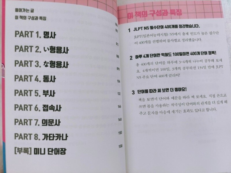 일본어는 고등학교 때 제2외국어였는데 한참 공부를 안했더니 모르는게 너무 많네요 그당시 일본어가 신선하고 재미있어서 잘하고 싶었는데 수능준비에 몰두하고 대학교 가서는 전공과목과 영어에 신경쓰느라 소홀히 했더니 기억이 잘 안나요 그래서 다시 일본어를 열심히 배우고 있습니다 일본어는 여러모로 도움이 많이 되고 일본 가서도 대화할 수 있도록 차근차근 배우고 있는데요 일본어능력시험 필수 400개가 정리된 책이라니 저에게 필요한 책입니다 공부하다가 JLPT일본어 능력시험을 보는게 목표인데요 이 책은 필수 단어를 잘 정리해놓았습니다 일본어는 영어와달리 한국어랑 어순이 같아서 단어만 잘 외우면 어렵지않게 회화가 가능합니다 다만 한자가 거의 대부분이라 외우기가 어렵습니다 단어의 크기가 크고 파스텔색으로 되어있어서 한눈에 잘들어오고 보기가 너무 편합니다 히라가나와 뜻은 대부분 아는것들인데 역시나 한자가 문제네요..한자를 외우려면 시간이 걸리겠습니다 그래도 다시 시작하는 공부라 설레고 좋습니다 단어와 후리가나가 쓰여있고 아래에는 일상에서 쓰는 문장이 있어서 활용하기 좋고요 단어를 명사,형용사,동사 등등 품사별로 정리해놔서 단어를 외우기가 더 좋습니다 마지막 부록에는 미니 단어장이 있는데요 평소에 갖고 다니면서 보면 도움이 많이 됩니다 JLPT N5 필수단어 400개가 쓰여있는 이 책으로 하루에 4개만 익혀도 100일이면 다 외울 수 있으니 시험대비로 좋은 단어장입니다 일본어 공부하시는 분들에게 추천합니다 일본어 단어 이 책으로 공부하세요 출판사로부터 도서를 제공받아 작성한 솔직 후기입니다
