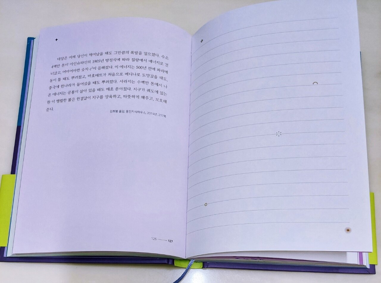 고민이 있거나 막막하고 불안할 때 책을 읽으며 마음을 차분하게 만들면 생각지도 못한 깨달음을 얻습니다 고민의 원인이 보이고 해결책을 찾거나 지금의 걱정이 일어나지 않는 일에 대한 것이라는 걸 느끼기도 하고 스스로의 내면을 깊이 들여다보며 나라는 인물을 좀 더 이해하게 됩니다 주옥같은 문장들을 읽고 쓰는 시간이 더 나은 오늘과 나를 만들어주기에 필사는 좋은 습관입니다 필사 노트, 필사 책을 검색하면 유명한 위인들의 명문장을 짜깁기한 도서들이 많은데 읽어보면 내용은 비슷비슷해서 아쉬울 때가 많습니다 이 책은 수많은 필사 노트 중에서도 유독 관심이 많이 갔는데 그 이유는 저자가 천문학자이기 때문입니다 인문학을 사랑하는 천문학자가 고르고 고른 80 작품 속 최고의 문장들이라니 기대가 많이 되었습니다 "책방 과학자의 인문학 필사 노트"는 인문서, 과학서, 문학서, 에세이로 나누어 책의 제목과 인상 깊은 명문장, 저자의 느낌과 생각을 써 놓았고 필사를 할 수 있는 줄 노트가 있습니다 매번 같은 문장들에 식상해질 무렵 이 책은 좀 더 의미 있고 특별하고 배울 점이 많습니다 책을 많이 읽었다고 생각했는데 80개의 작품 중에서 제가 읽은 책이 있는지 찾아보니 너무 적네요 저자가 소개해 준 책들이 어려워 보이지만 꼭 읽어봐야겠습니다 책은 우리에게 많은 지식과 양분을 주며 튼튼한 뿌리를 만들어 줍니다 인생을 살아가는데 필요한 교훈과 지혜를 얻고 단단한 사람이 될 수 있게 필사는 꾸준히 하는 걸 추천합니다 우리가 사는 세상은 넓은데 경험하고 속해 있는 세상은 좁은 것 같습니다 더 넓게 생각하고 바라보며 내가 서 있는 당장 보이는 공간이 아닌 우주 저편까지 생각하면서 살아가야겠습니다 "책방 과학자의 인문학 필사 노트"는 그동안 읽은 명문장들과는 다른 과학, 철학, 인생이 담긴 심오한 내용들이기에 꼭 읽어보시길 바랍니다 이 리뷰는 컬처블룸을 통해 출판사에서 도서를 제공 받아, 직접 읽고 작성한 리뷰입니다.