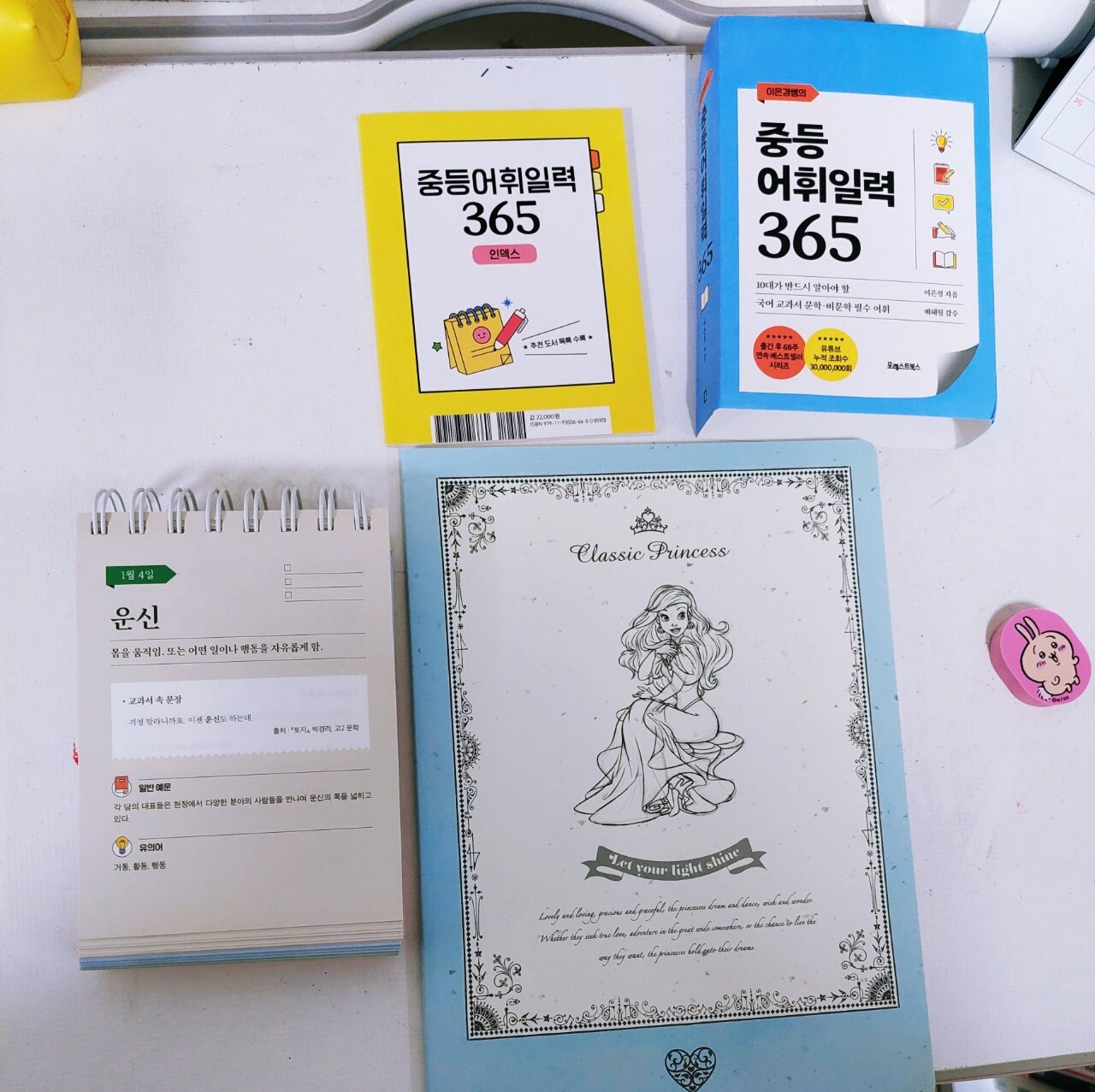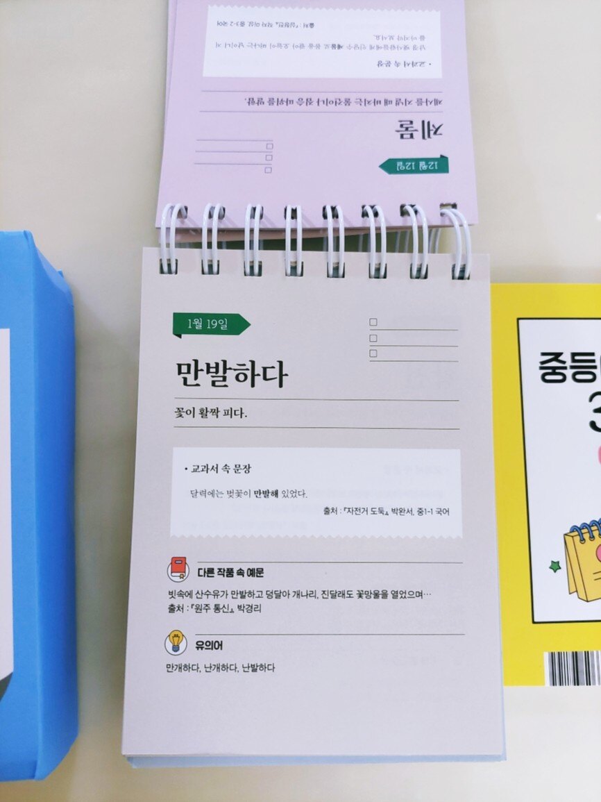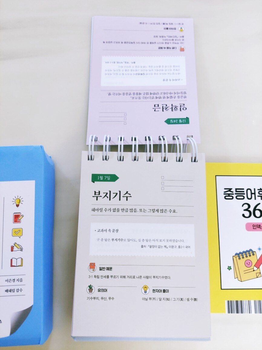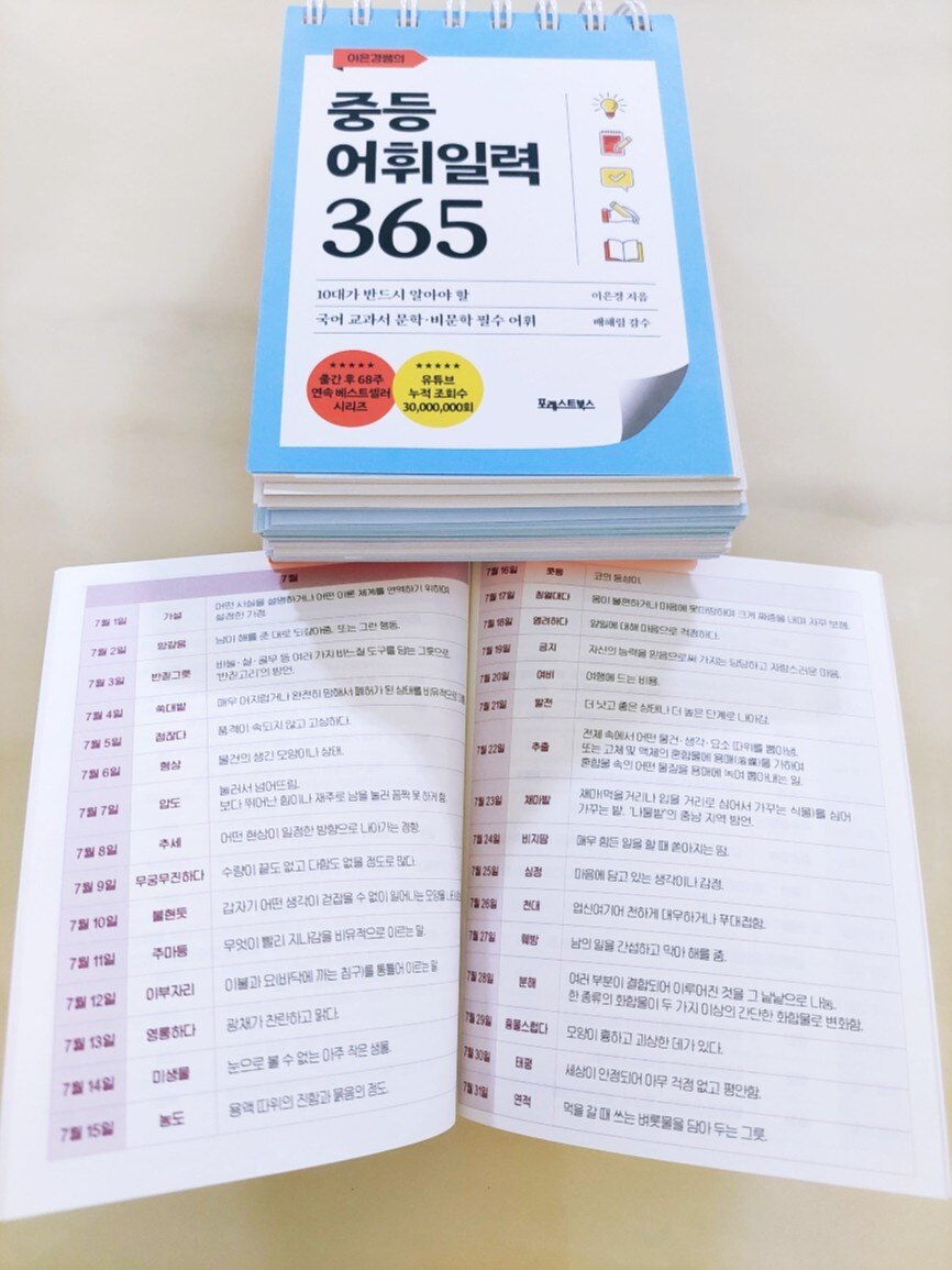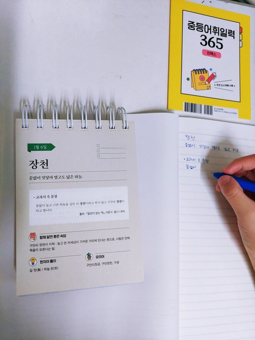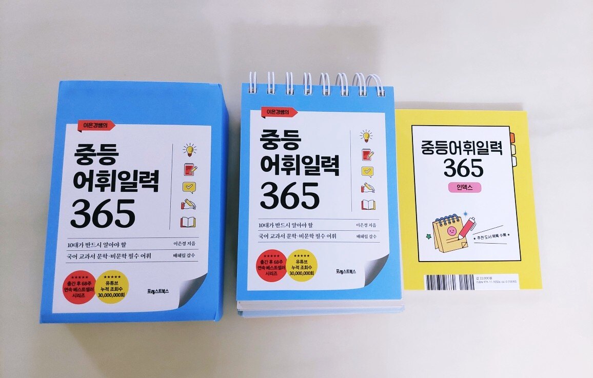 문해력은 아이들에게 정말 중요한 능력입니다 아무리 강조해도 지나치지 않은 문해력은 두뇌 성장판이 열려있는 10대 때 가장 효과적으로 두뇌를 사용할 수 있기에 독서를 많이 하고 다양한 어휘들을 익히며 좀 더 고급스러운 표현을 쓸 수 있어야 합니다 아이들이 두뇌를 더 가치 있게 사용하고 지식을 쌓으며 자신의 능력을 높이고 창의적으로 사고하며 다양한 관점으로 바라볼 수 있도록 노력해야 합니다 문해력은 아이들이 커서 자신이 바라는 인생을 살아가는데 훌륭한 연료가 됩니다 문해력의 기본은 무엇일까요 바로 어휘입니다 어휘의 의미를 모르면 문제를 풀 수 없기에 어휘를 이해하고 많이 알아야 합니다 "중등 어휘 일력 365"는 10대가 반드시 알아야 할 국어 문학·비문학 필수 어휘를 정리하여 아이들이 읽고 배우며 이해할 수 있게 해주는 일력입니다 필요한 어휘들로 구성되어 아이들에게 많은 도움이 됩니다 중등 들어가기 전에 미리 공부하여 수업 시간에 당황하지 않도록 아이가 차근차근 읽어보았습니다 주어진 어휘의 의미를 읽고 이해한 후 교과서 속에서 어떤 문장으로 쓰이는지 보았습니다 다른 작품 속 예문을 통해 다양한 문장을 만들어 보기도 하고 본문에 제시된 유의어를 이해한 후 관련 문장도 만들었습니다 어휘를 많이 알면 다양하게 사고할 수 있고 생각 머리가 발달하여 공부머리로 이어집니다 공부를 잘하는 아이들일수록 어휘력이 좋습니다 문제를 해결하는 능력이 높다는 건 그만큼 아는 게 많고 이해력, 사고력, 창의력, 직관력이 좋다는 거니까요 아이가 모르는 어휘, 알고는 있는데 의미를 정확히 설명하지 못하는 어휘를 노트에 쓰면서 외웠습니다 문장으로 익히니 이해가 잘 된다며 필사를 즐겁게 했습니다 평소에도 저와 함께 명문장을 필사하는 걸 좋아하는 아이라 중등 어휘를 쓰는 것도 재밌어합니다 어렵게 생각했던 어휘들을 의미를 알고 나니 이제는 어렵지 않다며 배우는 게 좋다고 합니다 아이들 입장에서는 문제를 풀거나 책을 읽을 때 모르는 어휘가 나오면 많이 답답했을 텐데 이렇게 알아가는 걸 즐겁게 받아들이니 기특하고 대견했습니다 일력을 넘기며 궁금한 걸 추가로 질문하고 문장을 만든 후 맞는지 물어보기에 잘했다고 칭찬해 주었습니다 이런 습관들이 글을 쓰는 능력을 키워주고 어른이 되어서도 자신만의 특별한 능력이 되어 남들보다 뛰어난 장점이 됩니다 아이가 매일매일 필사하며 "중등 어휘 일력 365"에 나오는 어휘들을 완벽하게 알 거라고 합니다 여기에 나오는 어휘들을 다 안다면 중등 내신에 큰 도움이 될 겁니다 요즘 아이가 다양한 어휘를 사용하여 글을 쓰기 시작했는데 재밌나 봅니다 완성하면 보여준다니 기대가 됩니다 단어를 암기할 때 소리 내어 읽는 게 효과가 좋습니다 영어 단어뿐만 아니라 국어 어휘도 말하고 듣는 게 더 도움이 되므로 아이가 읽으면서 이해하고 암기했습니다 초판 한정 특별 부록 "중등어휘일력 365 인덱스 노트"가 함께 들어 있습니다 작고 가벼워서 주머니에도 쏙 들어가고 휴대하기 좋습니다 책상 위에 놓은 일력은 집에서 보고 학교나 밖에서는 노트를 들고 다니며 반복해서 읽는 것을 추천합니다 10대 청소년 추천 도서 목록까지 정리되어 있어서 아이들이 책을 고르기도 편합니다 시중에 나온 도서들이 워낙 많으니 아이들이 뭘 읽어야 될지 잘 모르는데 추천 도서 목록을 통해 읽어야 할 책이 간추려지니 도움이 많이 됩니다 덕분에 저도 추천 도서를 함께 읽으며 아이들과 이야기 나누고 토론하며 아이들의 생각을 들어봤습니다 아이들이 무엇을 하고 싶은지 어떤 어른이 되고 싶은지 깊은 대화도 나눌 수 있었습니다 일력은 부담 없이 자연스럽게 익힐 수 있다는 장점이 있기에 아이들 책상에 사자성어, 영어 일력을 놓았는데 중등 어휘 일력도 놓으니 너무 좋습니다 기대 이상으로 만족스러웠고 아이도 좋아합니다 "중등어휘일력 365"로 어휘 공부하는 걸 적극 추천합니다 좋은 책 감사합니다