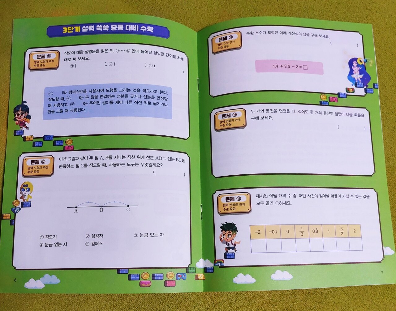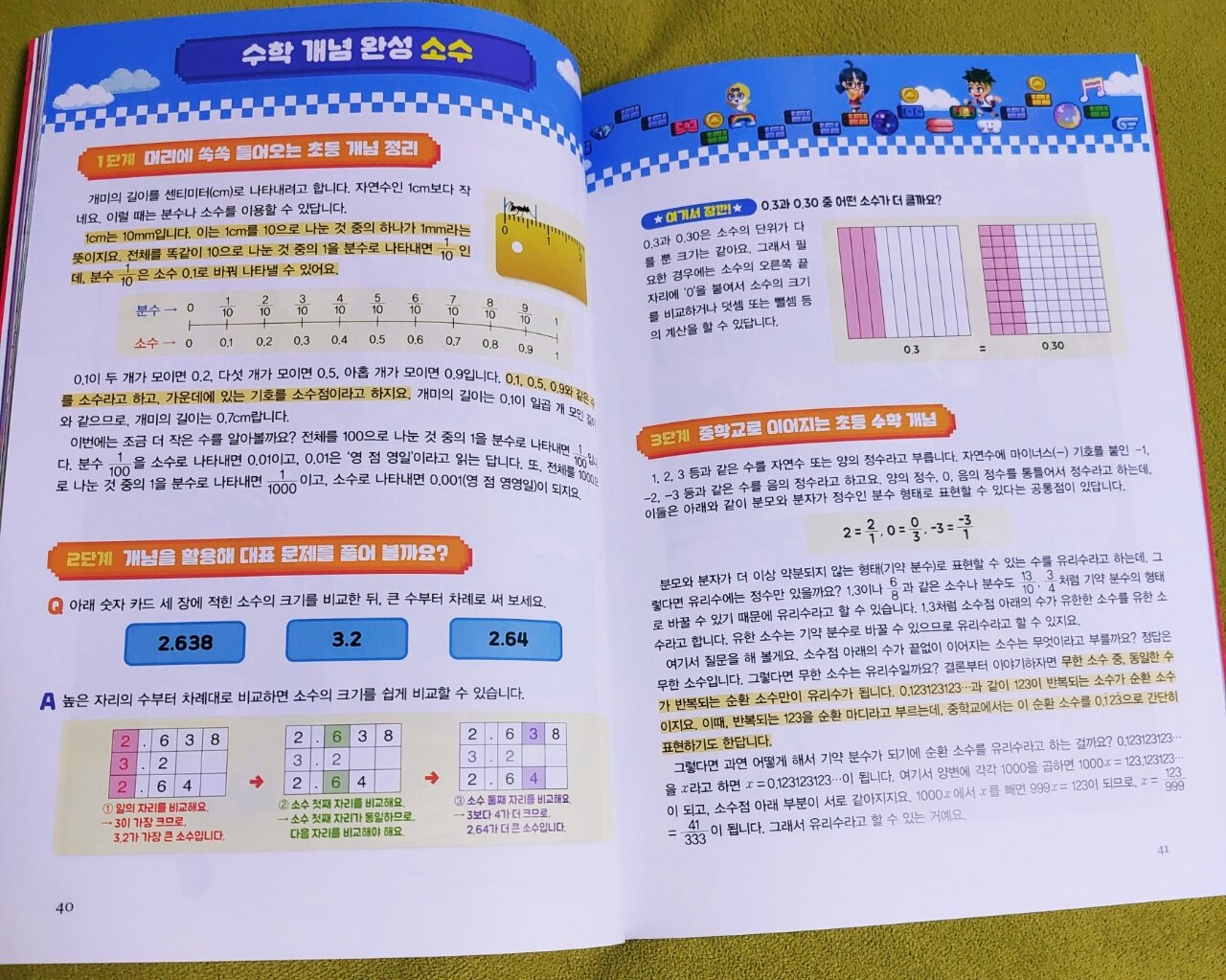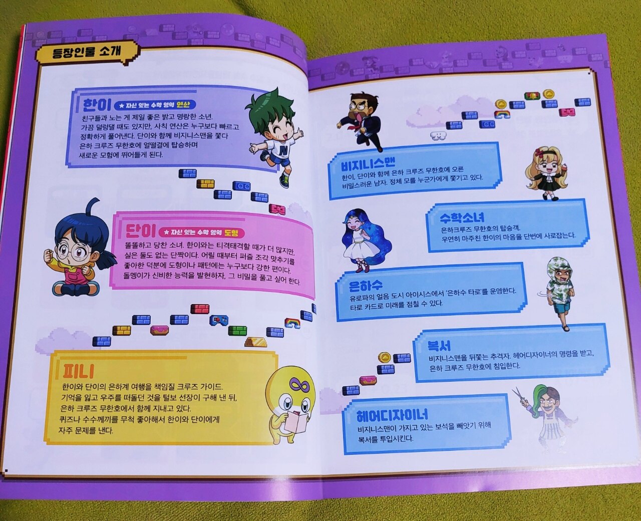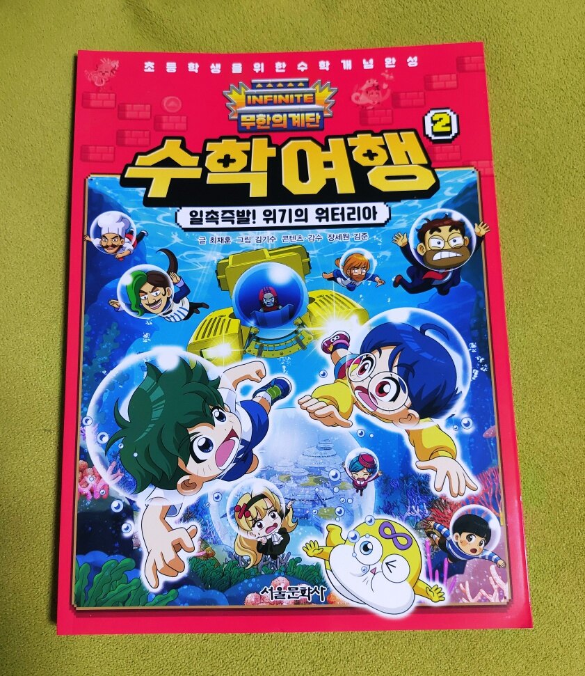 무한의 계단은 아이들에게 인기 있는 게임입니다 신나는 음악과 함께 계단을 오르는 게임인데 단순해 보여도 재밌는 모양입니다 호기심에 해봤는데 저는 어렵더라고요 게임으로 알게 된 무한의 계단이 친근하고 익숙한 캐릭터들로 구성된 책으로 나왔습니다 아이들이 너무 좋아합니다 특히 아이들이 어려워하는 수학을 아이들의 눈높이에 맞게 구성한 책이라 이해하기도 쉽고 만화로 되어 있어서 재밌게 읽을 수 있습니다 무한의 계단 시리즈가 다양한데 다 인기도서라 하나씩 보는 재미가 있습니다 아이들이 이번에 읽은 책은 "무한의 계단 수학여행 2: 일촉즉발! 위기의 워터리아" 입니다 1권을 재밌게 읽었기에 2권도 기대가 되었습니다 2권도 초등 수학이 골고루 섞여 있고 개념 정리가 잘 되어 있습니다 아이들이 소수를 처음 접하면 많이 헷갈려 합니다 자릿수 이동과 덧셈, 뺄셈을 적응하는 데 시간이 걸리는데 눈으로 봤을 때 자연수에 익숙하다 보니 어렵게 느껴지나 봅니다 하지만 잘 이해하면 쉽고 간단합니다 책은 시작부터 재밌는 그림으로 아이들이 관심을 갖게 하고 사고력 수학을 난센스 퀴즈처럼 맞추게 하여 숫자에 대한 호기심을 불러옵니다 어른들이 읽어도 재밌고 아이들에게는 자연스럽게 수학을 이해하게 만들어 줍니다 수학 개념 완성이라는 코너에서는 수학의 개념을 그림과 함께 설명하여 아이들이 쉽게 이해할 수 있게 해줍니다 수학 교재에 나오는 개념들을 한 장에 담아 깔끔하고 쉽게 설명이 잘 되어 있습니다 중학교 수학까지 이어지는 초등 수학 개념은 정확히 이해하고 넘어가야 합니다 아이들이 수학을 잘하는데 가장 중요한 게 개념이기에 완벽하게 이해해야 수학을 재밌게 잘할 수 있습니다 무한의 계단 수학여행 2권에서 소수, 합동과 대칭, 비와 비율, 소수의 덧셈과 뺄셈, 평면 도형의 이동을 만화와 함께 재밌게 읽었습니다 수학에 관한 다양한 상식, 지식을 배우며 일상 속에서 수학이 모든 학문과 연결되어 있다는 것을 알고 아이들이 흥미로워했습니다 저도 같이 배우며 아이들과 수학을 주변에서 찾아보는 시간이 즐거웠습니다 부록으로 수학여행 워크북이 있습니다 책을 읽고 잘 이해했는지 문제를 풀어보며 확인할 수 있습니다 저희 아이들에게는 쉬워서 넘어갔지만 다른 아이들은 재밌게 풀 수 있을 것 같습니다 또 다른 부록으로 19단표가 들어 있어서 이것도 좋았습니다 아이들이 대결하는 게 재밌었고 무작위로 문제를 내서 빨리 맞추기 게임도 했습니다 책의 내용과 구성이 좋은데 부록도 다양하게 들어 있어서 매우 만족스러웠습니다 이 책은 아이들이 꼭 읽어보길 바랍니다 수학을 쉽고 재밌게 배울 수 있고 수학에 대한 자신감도 올라갑니다 좋은 책 감사합니다 이 책을 아이들과 함께 읽어보시길 적극 추천합니다