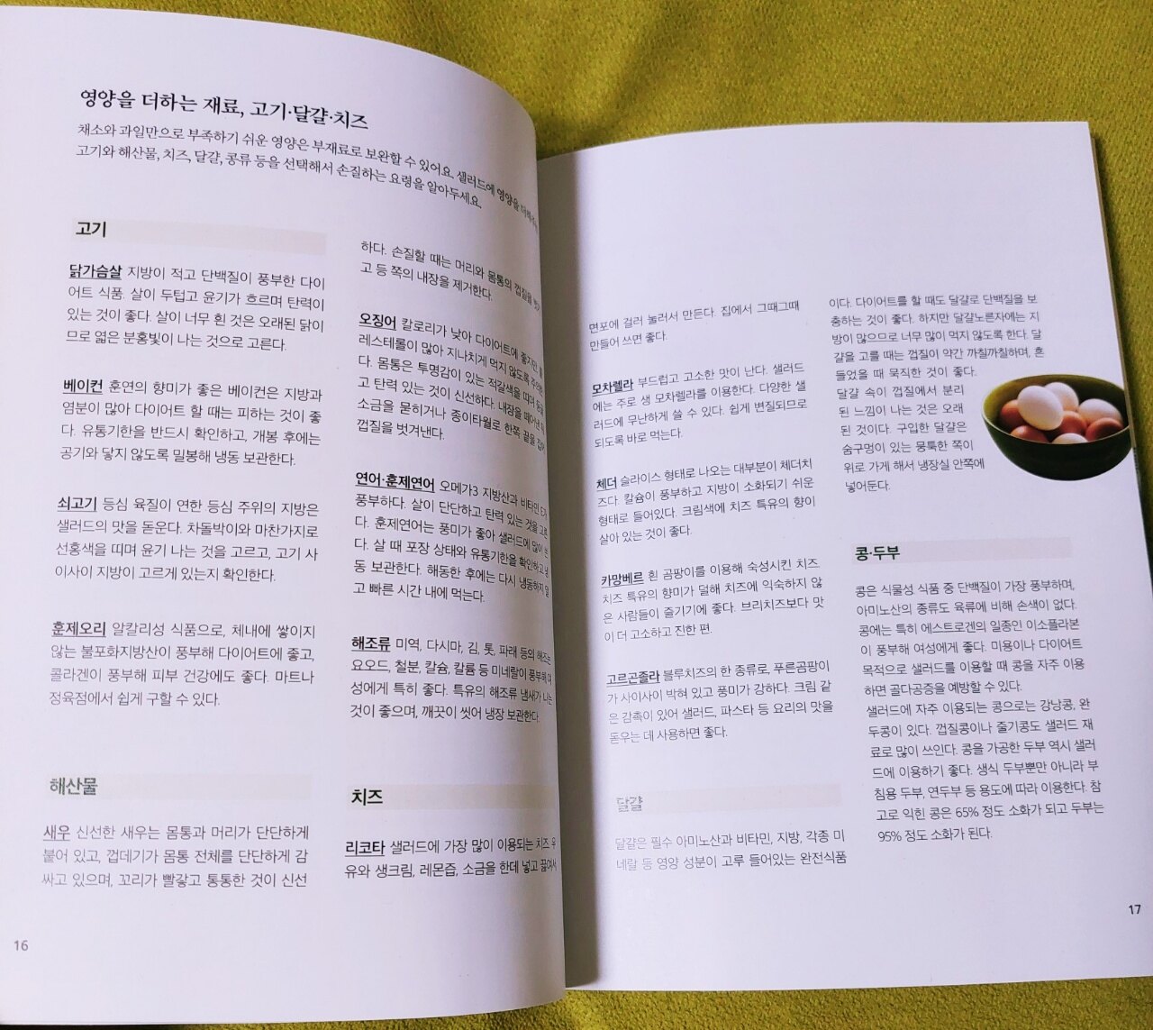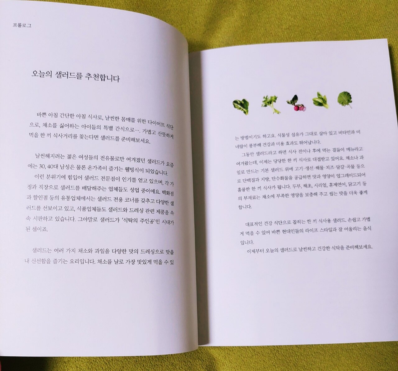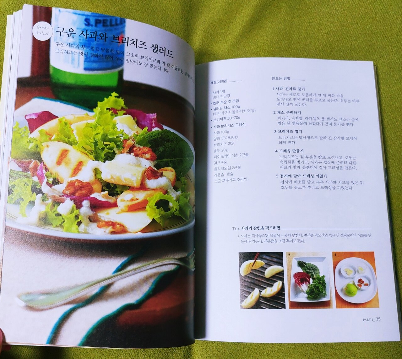 잘못된 식습관으로 건강에 적신호가 오는 경우가 많습니다 각종 첨가물에 고칼로리, 음주, 흡연 등으로 현대인들에게 비만, 당뇨 등 다양한 문제가 발생하고 있기에 우선적으로 식습관을 건강하게 바꿔야 합니다 신선한 야채를 섭취해야 되는데 아무래도 자극적인 입맛에 길들여지다 보니 덜먹게 됩니다 하지만 샐러드도 맛있게 만들면 근사한 식사가 됩니다 시중에는 맛있고 다양한 샐러드가 많지만 사 먹기에는 가격이 부담됩니다 집에서도 쉽게 만들 수 있는 샐러드로 건강을 챙기기 위해 [오늘의 샐러드]를 읽어 보았습니다 이 책은 그린 샐러드, 그레인 샐러드, 시푸드 샐러드, 미트 샐러드 등 4개 파트로 구성되어 있고 46가지의 샐러드 레시피로 매일 골라 먹는 재미가 있습니다 샐러드의 맛을 살려주는 기본 드레싱도12가지나 되서 매번 색다르게 먹을 수 있습니다 샐러드의 기본 재료의 종류와 특징, 손질 방법이 잘 설명되어 있고 영양을 더해주는 재료들도 알려 줍니다 각각의 재료에 들어있는 영양소를 읽고 균형이 골고루 잡힌 샐러드를 만들 수 있습니다 자신에게 필요한 영양소를 잘 파악하여 재료를 정하고 입맛에 맞게 만들면 됩니다 드레싱 만들 때도 순서가 있는데 잘 녹는 가루와 액체 재료들을 먼저 섞고 잘 섞이지 않는 재료들은 나중에 넣습니다 특히 향이 나는 재료는 믹서에 돌리지 말고 제일 마지막에 넣으라고 하네요 책에서는 배울 점이 많은데 샐러드의 칼로리를 줄이는 방법이 도움이 많이 되었습니다 체중 감량이 목표인 사람들에게 필요한 노하우입니다 <구운 사과와 브리치즈 샐러드> 사과를 구워서 먹어 본 적이 없어서 독특했습니다 구운 사과와 구운 견과류에 채소를 넣고 브리치즈를 곁들이니 맛있는 샐러드가 완성됩니다 사과를 다른 재료들과 블렌더에 갈아 드레싱을 만드니 사과의 상큼한 맛이 어우러져 맛이 더 풍부해집니다 <연두부 샐러드> 저칼로리에 소화 흡수가 잘 되는 부드러운 연두부 샐러드입니다 두부는 대부분의 사람들이 좋아하는데 특히 연두부는 부드럽고 먹기 편해서 자주 먹는 식품입니다 어린아이부터 치아가 불편한 노인까지 모든 연령대가 먹기에 좋은 샐러드입니다 책의 레시피가 어렵지 않고 간단하면서 설명이 잘 되어 있어서 따라 만들기 쉽습니다 책에는 생각지도 못한 샐러드 종류가 많아서 놀랐고 모든 샐러드가 재료들의 조화가 좋아서 다 만들어 보려고 합니다 건강하고 맛있는 샐러드를 가정에서 만들고 싶다면 이 책을 읽어보시길 적극 추천합니다 북유럽카페의 소개로 출판사로부터 도서를 제공받아 작성한 솔직 후기입니다