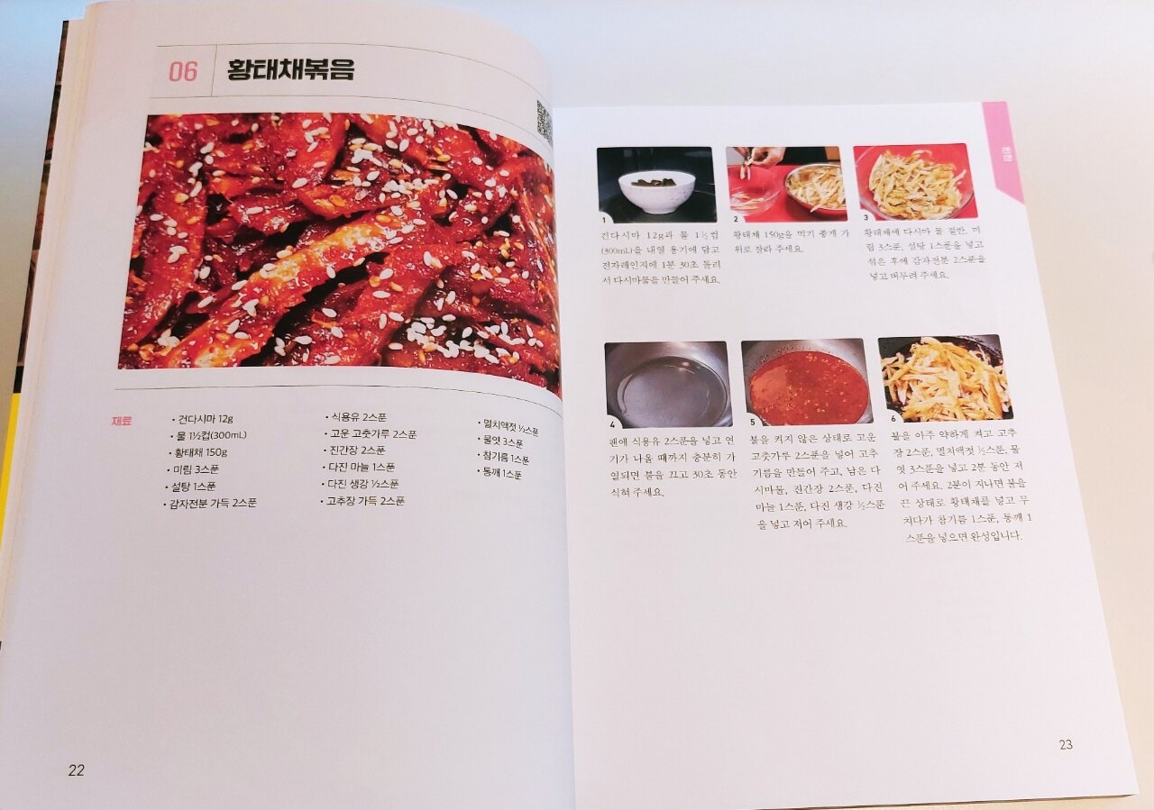 매일 먹는 반찬 걱정에 스트레스를 받습니다 혼자 먹으면 편할 텐데 끝나지 않는 밥과의 전쟁이 정말 힘든데요 항상 오늘은 뭐 하지.. 무슨 반찬을 하지.. 이 생각을 많이들 하실 겁니다 식습관이 비슷한 사람이랑 산다면 편하겠지만 반대인 경우도 너무 피곤합니다 밥만 안 하고 살아도 지금보다 행복할 것 같은데요 요리에 자신 없고 하기 싫은 사람도 쉽게 배울 수 있는 김대석 셰프의 집밥 레시피를 배워보았습니다 레시피들만 봐도 딱 집밥입니다 집에서 맛있게 먹을 수 있는 반찬들이라 기대가 됩니다 요리를 시작하기 전 저자의 팁이 있습니다 계랑 기준, 간, 믹서기 사용, 불 조절을 간단히 설명해 주고 시작합니다 황태채볶음은 밑반찬으로 인기 있는데 보관이 짧지 않아서 만들어 놓고 먹기 좋습니다 제가 하면 바삭하면서 식감이 좋게 잘 안되고 눅눅한 느낌이던데 책의 레시피가 설명이 잘 되어 있어서 어렵지 않게 배웠습니다 사진으로 보여주니 이해하기가 쉽고 상단의 QR코드를 스캔하여 영상을 보니 요리가 오래 걸리고 어려운 게 아니네요 따라 만들면서 재밌게 배웠습니다 맛있는 반찬이 완성되었고 가족들도 맛있다고 해줘서 다른 반찬들도 도전해 보았습니다 급식달걀찜은 제가 좋아하는 반찬인데 레시피에 크래미도 들어가서 더 맛있어 보입니다 해본 적이 없어서 잘 될까 걱정했는데 레시피가 간단하더라고요 찹쌀가루를 넣는다는 걸 배웠고 기호에 맞게 다른 야채와 버섯도 잘게 썰어 추가하니 맛있었습니다 집에서 해 볼 생각은 전혀 못한 메뉴들도 많습니다 국밥이나 짬뽕은 사 먹기만 했는데 집에서 만들어 먹으면 칼로리도 조절할 수 있고 다양한 재료를 넣어 푸짐하고 맛있게 먹을 수 있을 것 같습니다 저는 김대석 셰프의 레시피를 보며 몇 가지 반찬에 도전했고 다 성공적이었습니다 집 반찬이 쉬울 것 같지만 간 맞추는 것도 어렵고 생각보다 맛이 없게 되었었는데 이젠 맛있는 반찬이 되니 요리가 전보다 더 재밌고 자신감도 생겼습니다 요리에 자신 없고 하기 싫으신 분들께 이 책을 적극 추천합니다 북유럽카페의 소개로 출판사로부터 도서를 제공받아 작성한 솔직 후기입니다