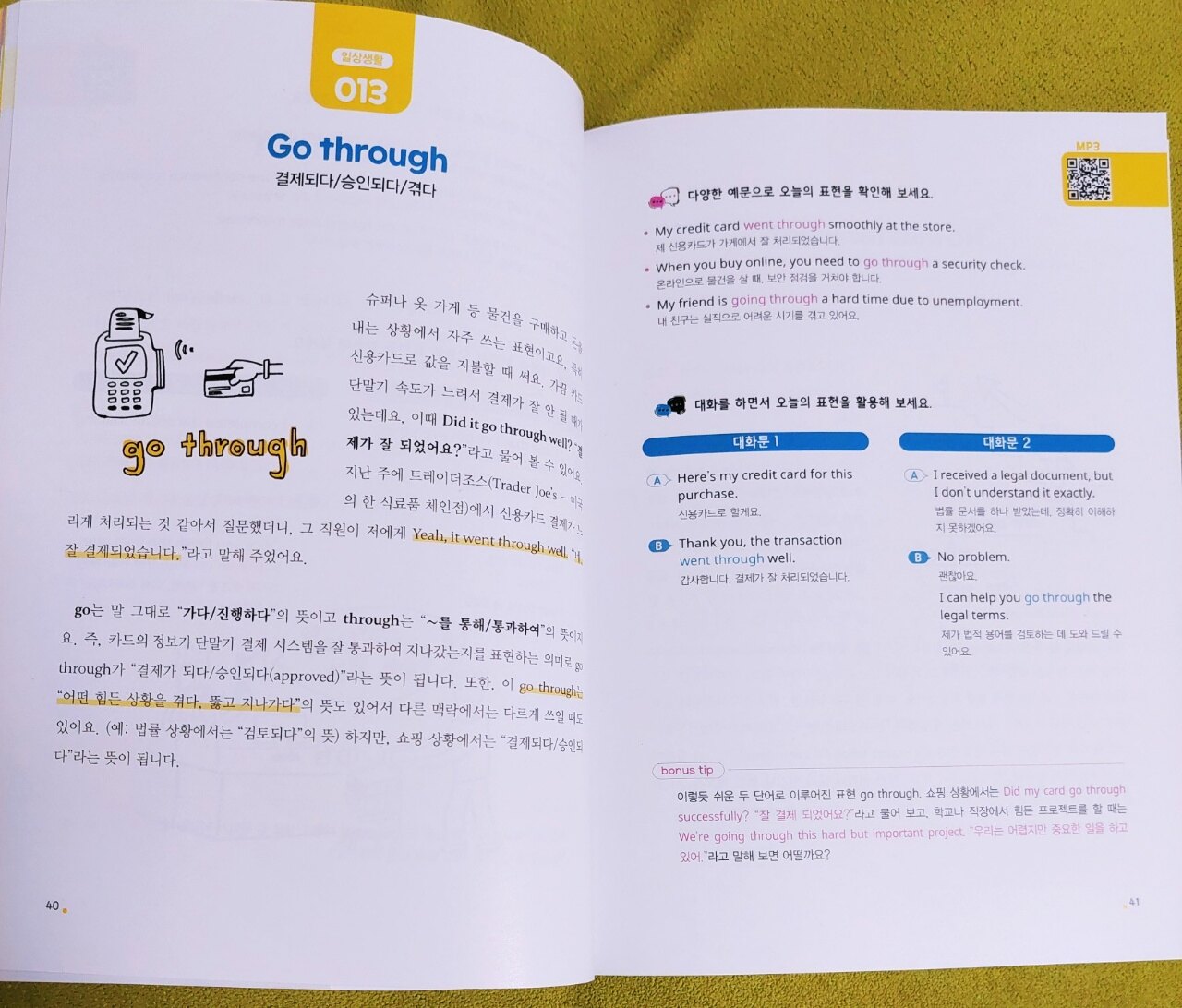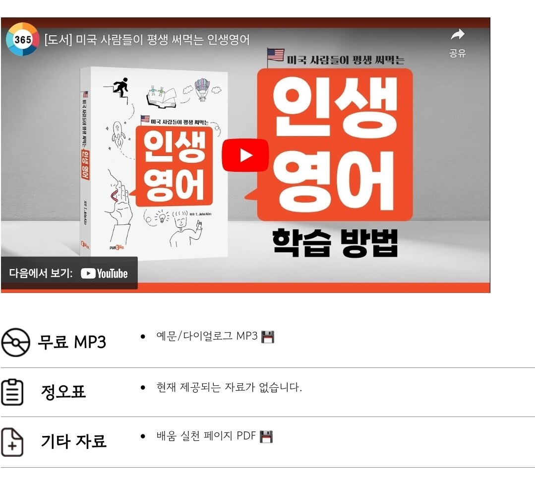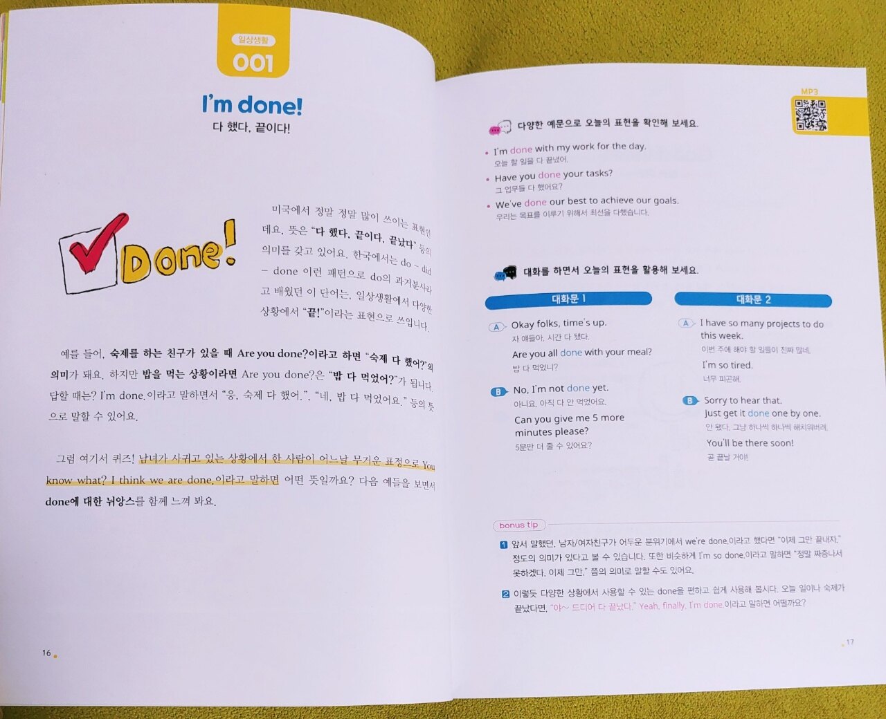 책으로 영어를 아무리 공부해도 실제 미국인들의 대화를 들어보면 차이가 있습니다 자연스럽게 회화를 하려면 일상 영어의 특징을 잘 파악해야 되는데요 저자의 이야기처럼 영어 문장을 접했을 때 우린 문법부터 확인합니다 이 문장의 문법이 맞는지 틀린 건 없는지요 다른 거에 신경 쓰느라 말한 이의 의도를 파악하는 게 늦어지기도 합니다 당황해서 생각하다 보면 대화가 끊기고 답답해지는데요 미국인들은 우리가 배우지 못한 그들만의 표현을 사용하기에 반드시 배울 필요가 있습니다 방송에서 봐도 미국에서 자란 연예인들이 미국에 가서 촬영을 할 때 순간순간마다 미국식 농담을 하며 분위기를 이끌어 갑니다 생소한 표현들이 나오면 미국식 표현이라고 덧붙여 설명해 주는데 그 표현들을 배우는 재미가 있습니다 영어는 자연스러운 회화를 위해 배우는 것이므로 자주 사용되는 표현들을 이해하고 배우기 위해 이 책으로 공부를 시작했습니다 어렵다고만 생각했던 영어가 심플하고 간단하다는 걸 깨달으며 영어 공부가 재밌어집니다 책의 시작에 있는 QR코드를 스캔하면 저자가 직접 알려주는 학습방법 팁이 제공됩니다 영상을 보고 나서 공부를 시작하니 도움이 많이 됩니다 꼭 영상을 보고 책 공부를 시작하시는 걸 추천합니다 책은 미국 일상에서 자주 쓰이는 표현들을 상황별로 분류하여 우리가 배우기 쉽게 구성되어 있습니다 깔끔하면서 간단하고 이해하기 쉽게 설명되어 있어서 기억하기 편하고 하루에 한 장씩만 공부해도 미국식 표현들을 배울 수 있으니 너무 좋습니다 많은 시간을 투자하지 않아도 매일 꾸준히 공부한다면 영어 실력이 매우 향상되며 영어에 자신감도 생깁니다 책의 상단에는 QR코드가 있습니다 QR코드를 스캔하면 경쾌한 음악과 함께 원어민의 발음을 들으며 공부할 수 있습니다 외국어는 원어민의 발음을 듣고 이해하는 게 중요하므로 반복해서 듣고 말하다 보면 자연스럽게 영어 문장이 나옵니다 도서출판 삼육오 홈페이지에서 배운 것을 복습할 수 있는 실천페이지PDF를 무료로 다운받을 수 있으니 꼭 같이 공부합니다 미국인들이 자주 사용하는 영어를 공부하고 싶다면 이 책으로 공부하시는 걸 적극 추천합니다 좋은 책 감사합니다 [부가 학습 자료] · 학습 방법 동영상 무료 제공 (QR제공) · 예문 학습용 MP3 무료 제공 (QR제공) · 대화문 MP3 무료 제공 (QR제공) · 실천페이지 PDF 무료 제공 (www.pub365.co.kr 홈페이지에서 무료 다운) 북유럽카페의 소개로 출판사로부터 도서를 제공받아 작성한 솔직 후기입니다