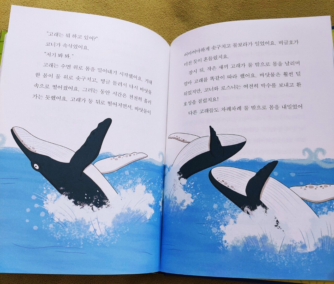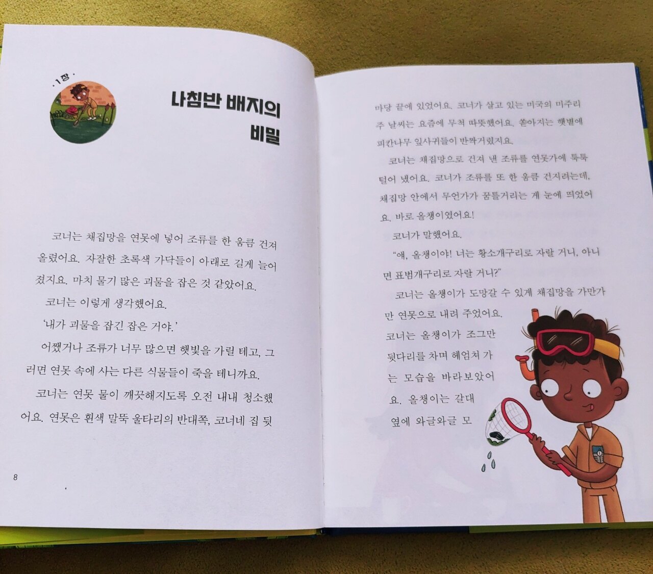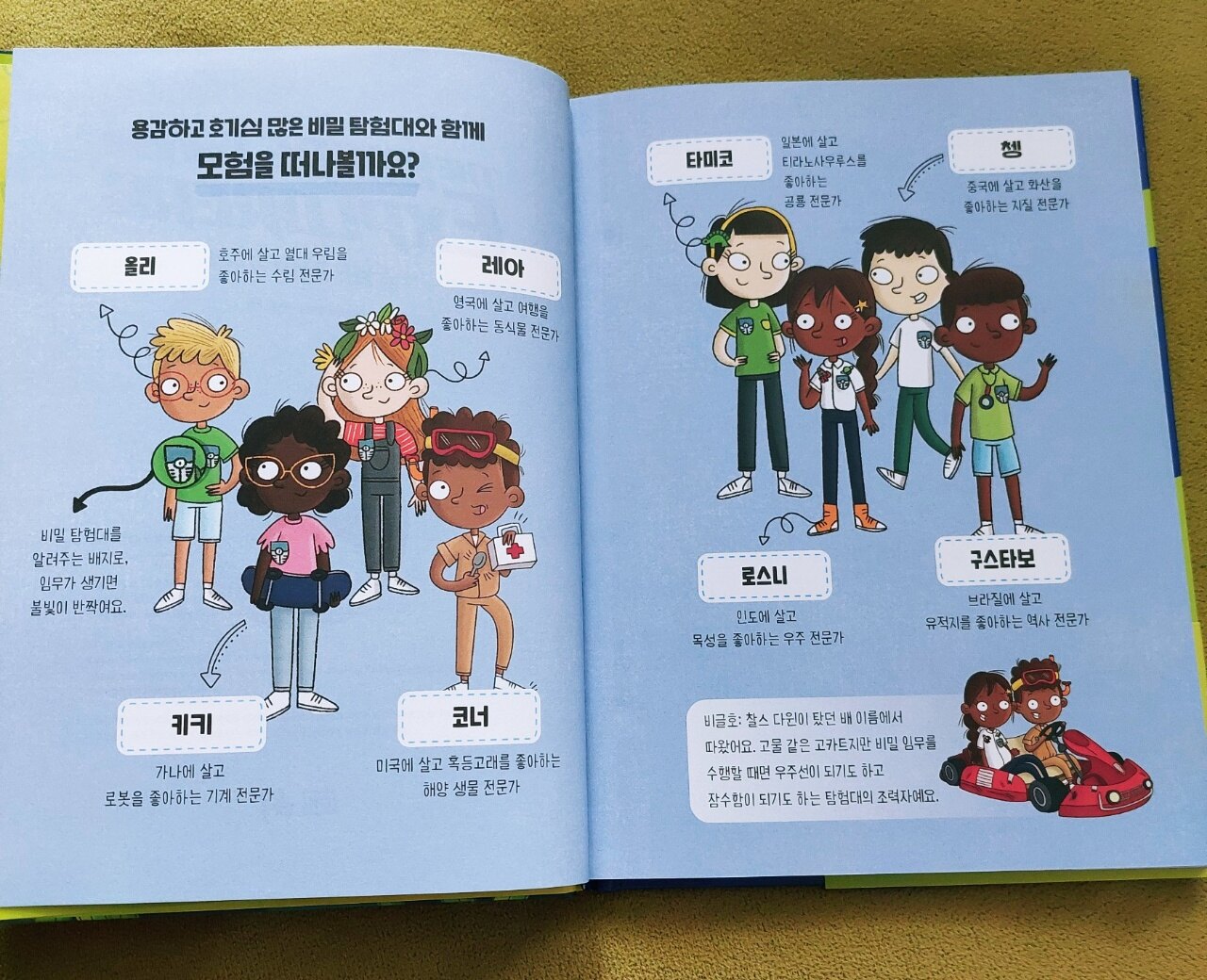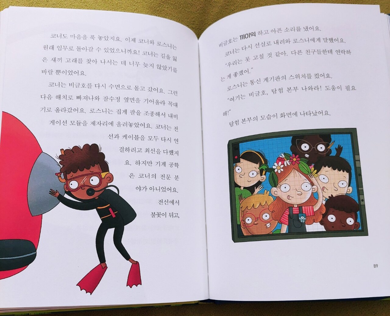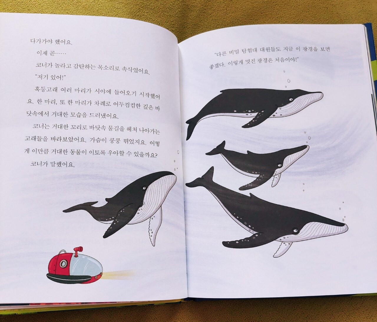 비밀 탐험대는 무슨 일을 하는 걸까요? 8명의 구성원으로 되어 있는 비밀 탐험대는 각 분야의 전문가들이 모여 있습니다 역시 평범한 친구들이 아니었네요 벌써부터 기대가 됩니다 비밀 탐험대는 비글호를 타고 비밀 임무를 수행하는 데 비글호는 필요에 따라 모습이 바뀐다니 멋진 것 같아요 더 궁금해집니다 어떤 임무를 수행하는지 책 속으로 들어가 보았습니다 비밀 요원 중 한 명인 코너는 집 뒷마당 끝에 있는 연못을 청소 중입니다 조류가 많아져 생태계를 어지럽히고 있어서 채집망으로 건져 올리고 있어요 어느 정도 조류를 건져낸 후 집으로 들어가려는데 나침반 배지와 똑같은 모양이 보입니다 바로 비밀 임무가 있다는 표시에요 코너는 순식간에 탐험 본부로 이동되었습니다 8명이 모두 모였고 누가 모험에 나설지 기대를 합니다 본부에서는 임무에 적합한 기술과 지식을 갖춘 대원을 두 명씩 뽑는데 이번 임무에는 코너와 로스니가 뽑혔습니다 코너는 해양 생물 전문가이고 로스니는 우주 전문가에요 본부에서 보여준 화면은 혹등고래들인데 우주 전문가인 로스니가 뽑힌 이유가 뭔지 궁금합니다 조류로 인해 고래가 이동 방향을 바꾸면서 길을 잃었습니다 바닷물이 더러워져 유기양분이 많아지면 붉은색의 미생물이 이상증식을 하게 되고 바다가 붉게 보이는 적조 현상이 발생하는데 이건 인간들이 바다를 오염시켜서 그런 거예요 바닷속 생물들이 인간들 때문에 삶의 터전에서 헤매게 되었어요 이번 비밀 탐험대의 임무는 고래가 남극 바다로 잘 갈 수 있게 도와주는 겁니다 비밀 탐험대는 출동한 대원들 외에는 본부에서 모니터로 지켜봅니다 혹시나 도울 일이 생길지 모르니 대기하는 건데요 모두가 함께 하니 든든하네요 걱 전문가들이 모여 있어서 서로에게 큰 도움이 됩니다 하지만 이번에 코너와 로스니에게 생긴 문제는 대원들이 직접적으로 도와줄 수 없어서 둘이서 스스로 해결합니다 어떤 문제가 발생한 걸까요 두 대원의 멋진 활약이 돋보이는 임무였습니다 이 책은 아이들에게 과학적 지식을 제공하며 재미와 풍부한 상상력을 갖게 해줍니다 바닷속을 묘사하는 장면은 실제 바닷속에 있는 듯한 착각을 주며 상상을 통해 바닷속 생물들의 아름다운 장면들을 떠오르게 해줍니다 또한 쓰레기와 오염으로 고통받는 바다를 보며 환경을 보호해야 하는 의무를 이해하고 배웁니다 바닷속에 우주 전문가 로스니가 함께 한 이유도 나오며 아이들이 과학을 보다 재밌게 배울 수 있어서 좋았습니다 이 책을 아이들과 함께 읽어보시길 추천합니다 기대 이상으로 너무 좋았습니다