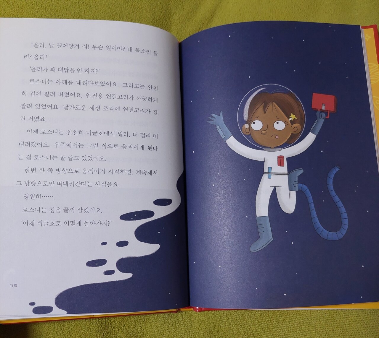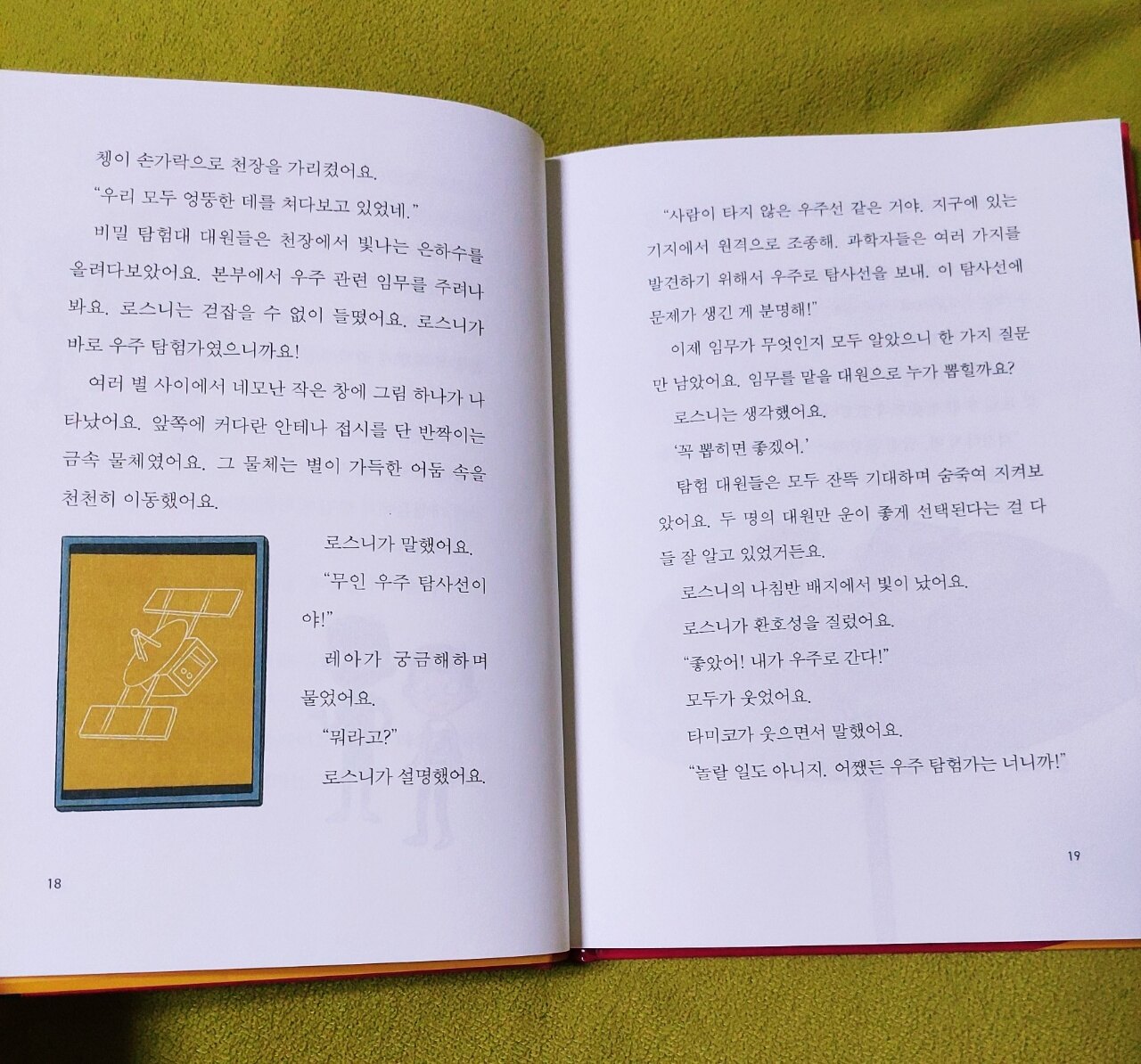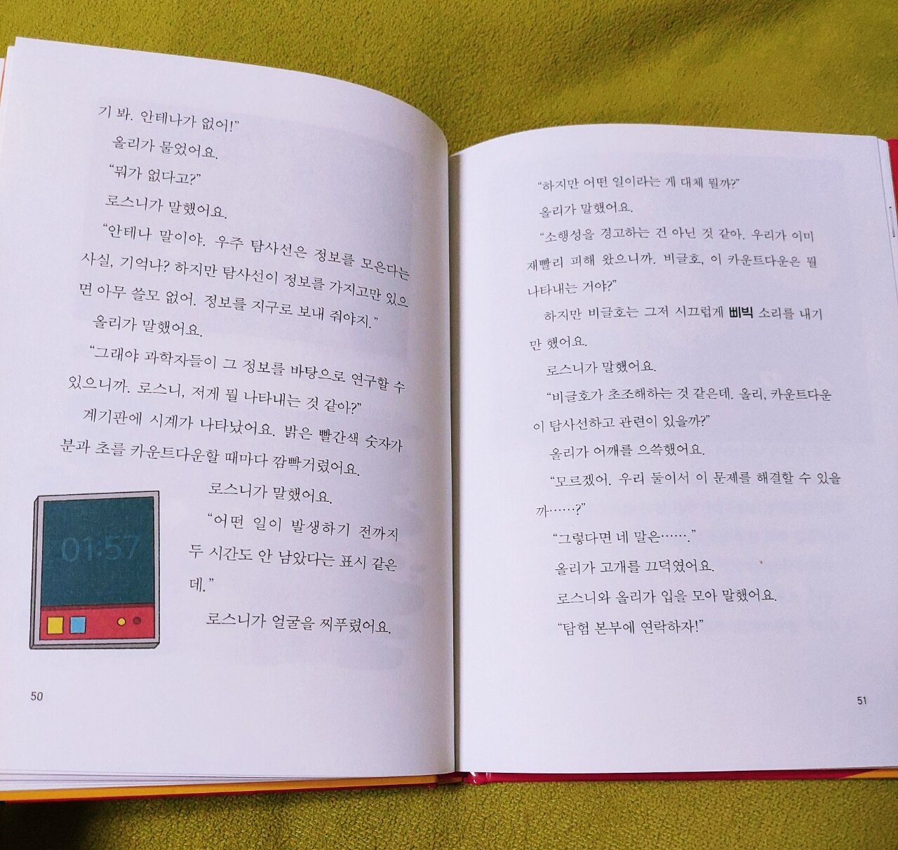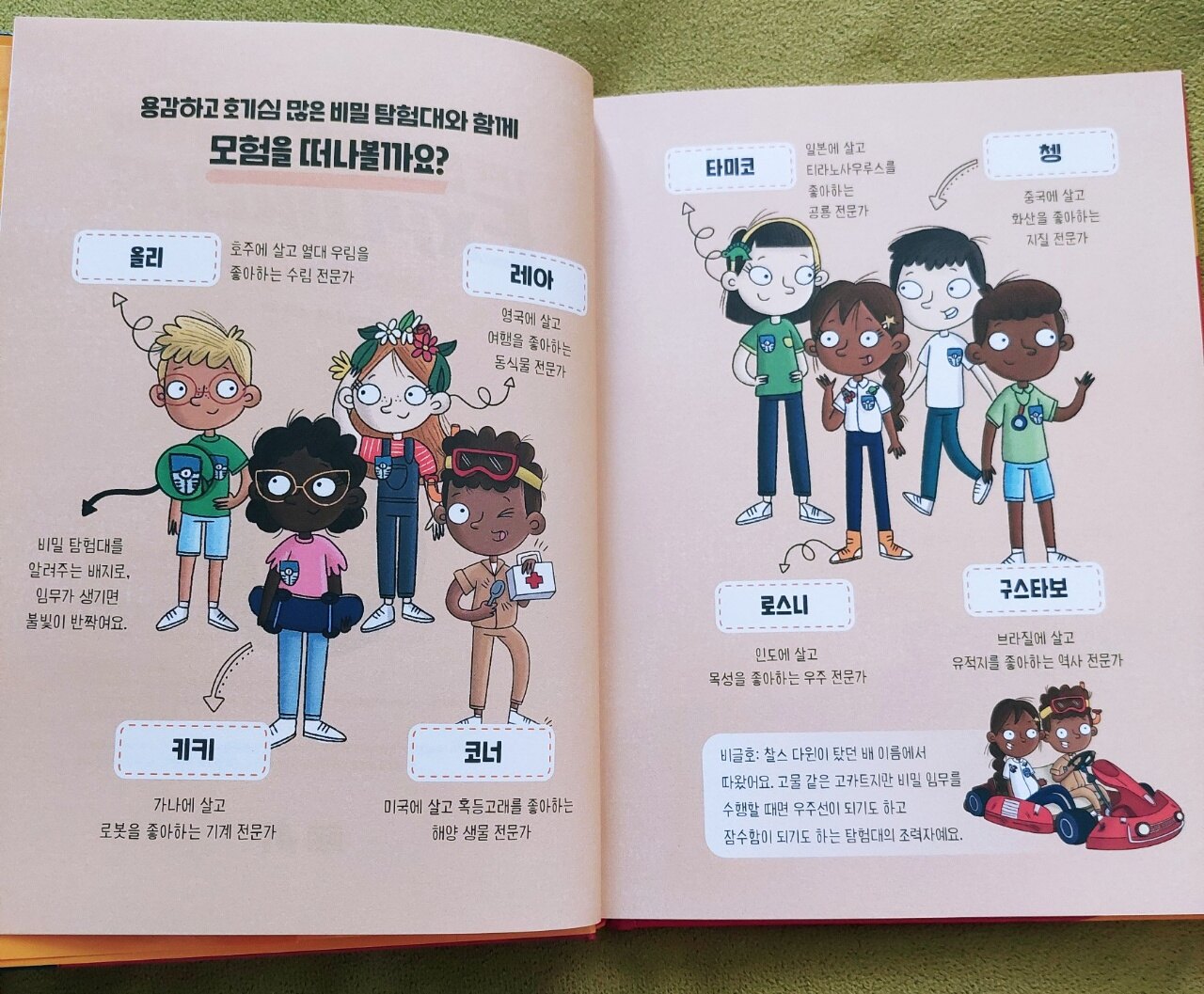 용감하고 호기심 많은 비밀 탐험대는 8명의 구성원으로 되어 있습니다 비밀 탐험대는 각 분야의 전문가들이 모여 임무를 수행하고 있습니다 나침반 모양이 나타나서 빛나면 탐험 본부로 순식간에 이동하게 돼요 이번에는 어떤 임무일까요 대원 중 누가 출동할지 궁금하네요 모두가 출동하고 싶어 하는데 선택되는 건 두 명이고 운이 좋게 선택된 대원은 나침반 배지에서 빛이 납니다 본부에서 모두가 숨죽여 기다리는데 무인 우주 탐사선이 나타났습니다 이번 임무와 관련된 힌트인데요 역시나 우주 전문가 로스니가 선택됩니다 또 한 명은 열대 우림을 좋아하는 수림 전문가 올리가 선택되었는데 과연 우주와 어떤 관련이 있는 걸까요 로스니와 올리는 비글호를 타고 순식간에 우주로 이동합니다 나머지 대원들은 도울 일이 있을 수도 있으니 각자 컴퓨터에 앉아 두 대원을 모니터로 지켜봅니다 지구에서 발사된 지 10년은 됐을 탐사선에 안테나가 없어요 이 탐사선의 이름은 오딘으로 혜성이 목성에 충돌하는 장면을 담는 게 임무인데 안테나가 없으니 자료를 저장하지 못하게 되고 과학자들이 일한 게 모두 헛수고가 되고 말아요 로스니와 올리는 얼마 안 남은 시간 동안 해결해야 하는데 두 시간도 채 남지 않아서 정신이 없습니다 대원들이 임무를 해결하는 과정에서 나오는 이야기들은 아이들이 알아야 하는 과학 지식들입니다 행성들의 특징과 중력을 이해하고 우주 탐사선, 로켓의 원리를 배우며 과학을 알기 쉽고 재밌게 배울 수 있습니다 우주와 행성에 관심이 많은 아이들이라 관련 책도 많이 읽고 모형과 영상을 자주 보고 직접 천체망원경으로 관찰도 했는데요 이 책을 읽으며 알고 있던 지식에 새로운 것들을 배우니 좋아했습니다 책을 읽는 동안 한순간도 지루할 틈이 없이 긴박하고 긴장되니 집중해서 읽게 되고 우주를 상상하며 아이들의 상상력, 사고력도 풍부해집니다 우주 전문가인 로스니가 위험한 상황에 용기를 내서 안테나를 끼웠지만 해결 후에는 자신이 위험한 상황이 되어 버립니다 산소 탱크가 몇 분이나 견뎌줄지 모르는 상황이지만 로스니는 당황하지 않고 침착하게 상황을 분석합니다 하지만 상황은 나쁩니다 로스니가 희망을 잃고 무서움을 느낄 때 올리가 나타나 구해줍니다 역시 올리가 로스니의 파트너로 뽑힌 이유가 있었어요 대원들의 모험을 통해 아이들은 많은 것을 배울 수 있었습니다 과학 지식뿐만 아니라 함께하는 협동심, 우정, 배려, 용기, 희망을 배우며 좋은 시간을 가졌습니다 어른들이 읽어도 재밌고 도움이 되는 책입니다 이 책을 아이들과 함께 읽어보시길 추천합니다 기대 이상으로 너무나 좋았고 재밌게 읽었습니다