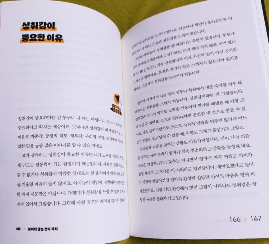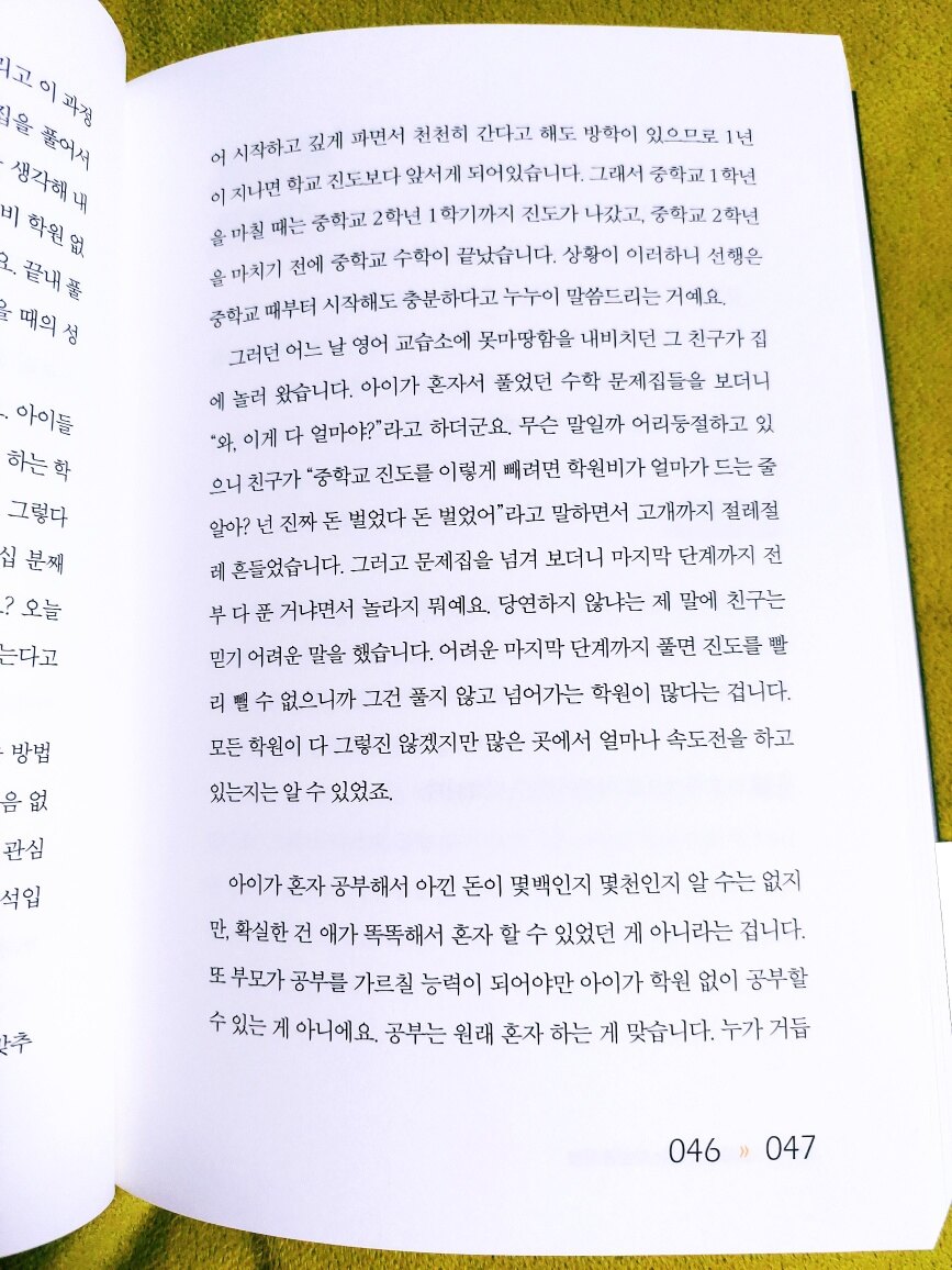내 아이를 위한 사교육은 없다 제목이 강렬하네요 아이의 능력과 현상태를 파악하지 않고 몰아붙이는 교육은 아이를 위한 게 아니지만 분명 필요한 사교육은 있습니다 내 아이의 상황에 맞게 적절하게 하는 걸 선호하고 아이도 배우고 싶은 게 있기에 저는 사교육에 찬성하는 편입니다 잘하는 아이 더 잘하게 만들어 주고 부족한 부분 채워주는 게 모든 가정에서 가능한 건 아닙니다 수학을 못하는 부모가 아이의 수학을 책임질 수 없고 아이 스스로 잘해서 전교 1등을 하는 아이도 드물기에 저는 이 책의 내용이 매우 궁금했습니다 저자의 아이가 특별한 게 아닐까 생각이 드는데요 책을 읽기 전에 초등맘 카페에서 주관하는 이분의 라이브 방송을 시청하며 질문을 많이 했습니다 제 질문에 대한 답은 못 들었지만 다른 분들의 질문과 이야기를 들으며 유익한 시간이었습니다 제가 궁금한 건 과학고 입학 후의 이야기였는데 초등 사교육과 초등 때의 이야기가 주를 이루다 보니 아쉬웠지만 강연의 주제가 초등 사교육이었기에 아쉬움은 뒤로했습니다 저자의 아이는 외부의 사교육을 하지 않고 중2 때 전교 1등을 했다고 합니다 공부는 아이가 스스로 해야지 효과가 있는데 가정에서 아이에게 어떤 긍정적인 영향을 주었을까요 저도 아이를 가르치지만 스스로 잘하고 싶어하고 욕심이 있고 노력하는 아이가 성적도 높습니다 그러려면 아이가 그런 마음이 생기게 만들어줘야 하는데 저자의 노하우가 궁금합니다 학원들은 비용만 비싸지 겉핥기 진도로 나가기에 대부분의 아이들은 수학 성적이 낮습니다 그래도 부모들은 자신이 못 가르치니 보낼 수밖에 없습니다 사교육이 초등 아이들을 상대로 돈을 버는 건 현실이죠 내 아이 실력은 모른 채 선행만 나가면 좋아하는 부모가 많다는 것도 충격이었습니다 현행 심화도 못하는 아이가 선행은 기본 교재로 많이 나가고 있더군요 결국 그 아이는 다시 돌아야 되고 버린 시간을 채우느라 고생할게 뻔한데 부모는 그걸 모르더군요 하지만 학원을 잘 이용하면 득이 됩니다 사교육을 믿고 맡기지 마시고 이용을 해야 합니다 돈 버리고 시간 버리는 사람들을 많이 보는데 그들에게는 그게 최선이라 안타깝죠 공부는 부모가 현명하게 시켜야 합니다 저는 영어 학원은 보내고 있지만 수학은 제가 잘 알기에 효율적으로 공부시키고 있습니다 현행 심화가 어느정도 완벽하기에 선행 심화를 소화하고 상위권의 성적을 유지하는 겁니다 수학은 확장이라 모든 단원을 꼼꼼히 개념 이해를 완벽하게 하고 넘어가야지 공식만 외우고 넘어가서는 안됩니다 저는 모든 공식을 개념 이해를 시키고 넘어갑니다 왜 이런 공식이 나왔는지 하나하나 풀어서 이해하면 문제를 풀 때 공식이 생각나지 않아도 유추해서 문제를 풀 수 있습니다 제발 학원 믿지 마세요 아이들에게 좋은 말만 하고 아이들은 그걸 받아들여서 잘 따라와 주면 얼마나 좋을까요 부모가 먼저 노력하고 이끌어줘야 되는데 감정이 앞서는 건 사실입니다 알고는 있는데 잘 안되는 부분들을 반성하고 더 노력해야겠습니다 책의 내용이 좋고 공감되는 부분들이 많습니다 그중에서 성취감인데요 초등 아이 수학을 제가 가르치는데 너무 하기 싫어하고 억지로 하는 거에요 그래도 저는 제가 가르치기에 더 신경 써서 해줬는데 아이가 흥미를 갖지 않으니 유명한 수학경시대회를 내보냈습니다 그런데 아이가 지역 1등을 했더군요 그날을 기준으로 수학에 대한 생각이 바뀌더니 이젠 수학은 항상 상위 1프로 안에 듭니다 뭐든지 계기가 중요한 것 같습니다 성취감의 중요성을 느낀 거죠 저자의 아이도 전교 1등이라는 타이틀에서 느낀 성취감이 과학고로 이끈 게 아닐까요 책을 읽으며 알고는 있지만 실천하지 못했던 것들이 수면 위로 올라오며 반성을 많이 했습니다 이런 부모가 있기에 저자의 아이도 잘 자란 거라고 생각이 듭니다 그 힘든 과학고를 본인의 의지와 능력으로 해낸 걸 보면서 저도 아이의 목표를 지지해 주고 응원해 주며 도와주는 부모가 돼야겠습니다 충분히 잘하고 있는 아이들에게 조바심 내지 않고 지금처럼만 재밌게 공부해 주면 좋을 것 같습니다 영어, 수학을 잘하고 제일 재밌다는 아이들을 보며 공부는 자신이 스스로 재밌게 해야 고득점으로 이어진다는 걸 알기에 아이들을 믿고 뒤에서 도와주며 이끌어줘야겠습니다 이 책의 내용이 좋아서 도움이 많이 되니 학부모라면 꼭 읽어보시길 추천합니다