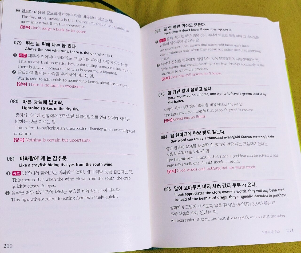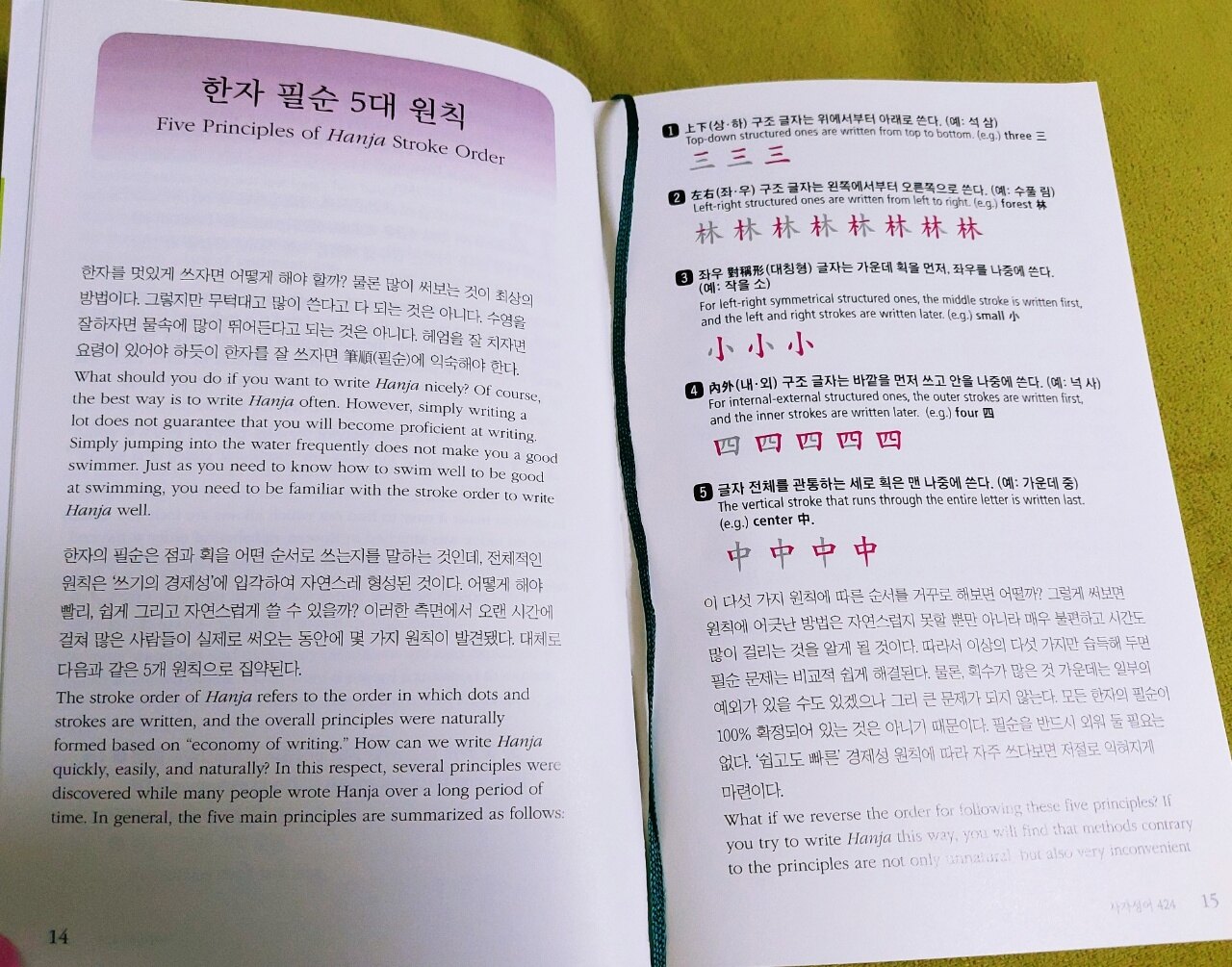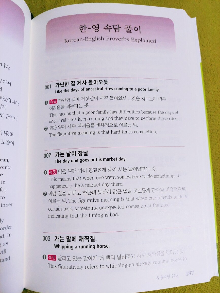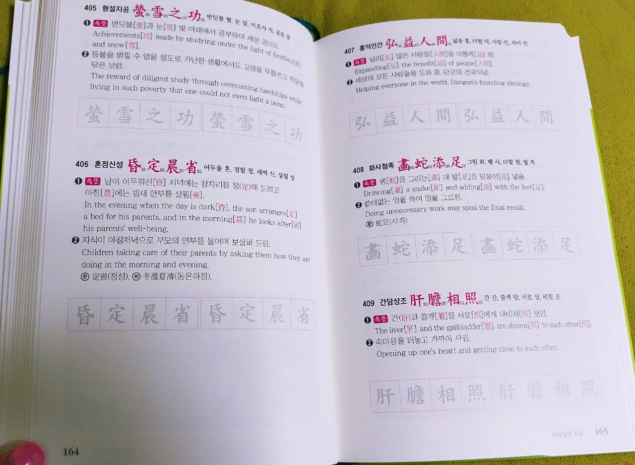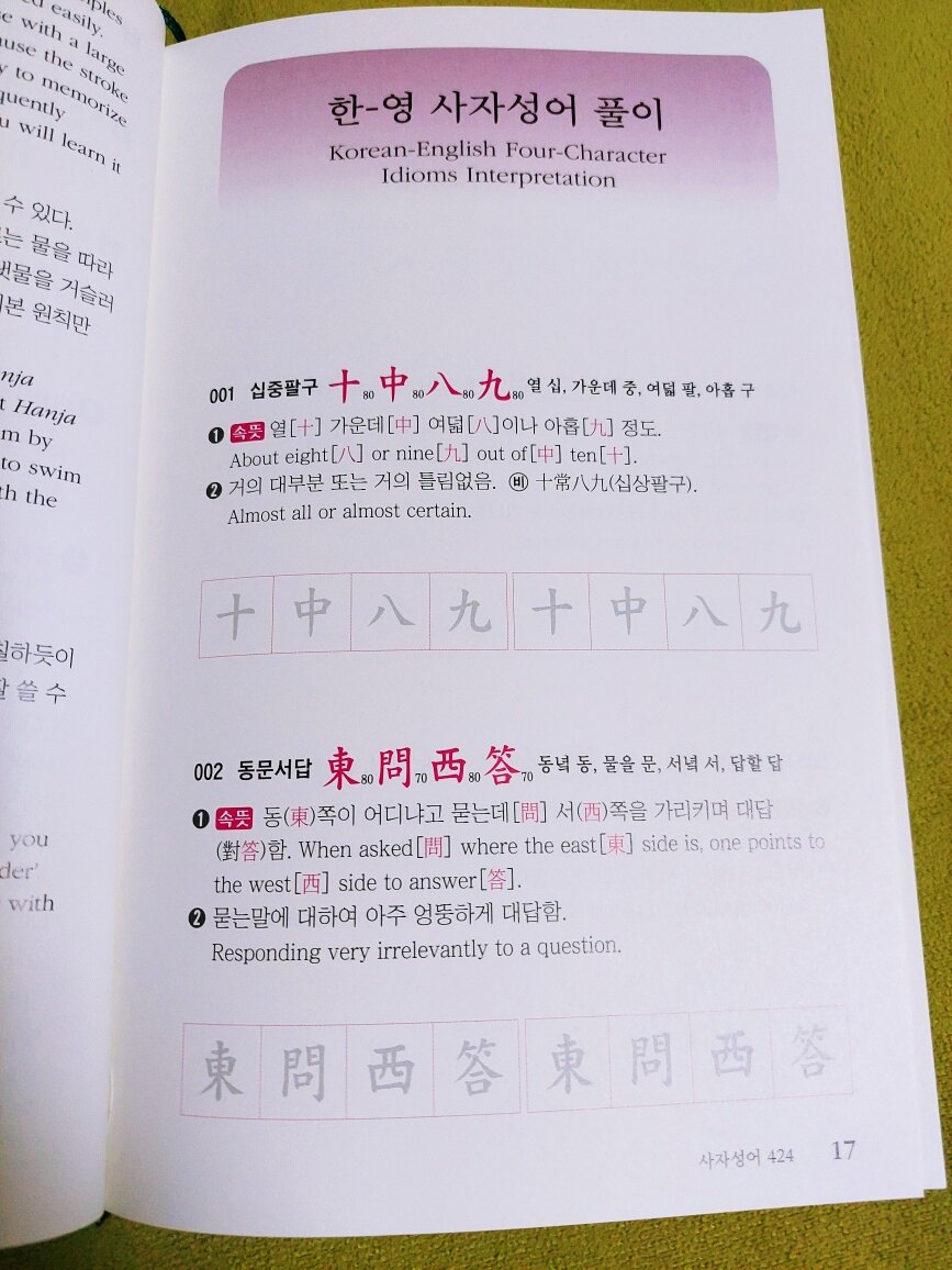 우리나라 어휘의 90프로가 한자입니다 한자의 의미를 이해하고 알아야 하는데요 특히 사자성어, 속담은 한글을 이해하는데 필수로 알아야 합니다 서점에서 사자성어, 속담 책을 많이 봤지만 영어로도 풀이해 놓은 책은 처음이라 너무나 기대가 되었고 읽고 싶었습니다 한국어의 품격을 높여주는 사자성어와 한자, 속담을 외국인도 이해하기 쉽게 한자의 속뜻을 영어로 풀이해 놓아서 한자와 한국어, 영어 세 가지 공부를 동시에 할 수 있습니다 한자는 필순도 중요합니다 점과 획을 어떤 순서로 쓰는지 알고 있어야 쓰기도 편하고 멋지게 쓸 수 있는데요 책에서는 기본적으로 알아야 하는 필순의 순서를 알려 줍니다 그리고 책 끈이 있어요 책갈피는 잃어버리기 쉽고 보관이 불편할 수 있는데 책 끈이 달려 있어서 편리합니다 기억하고 싶은 곳이나 읽던 부분을 표시하니 찾기 쉬워서 책 끈을 선호하는데 일반 책들에는 잘 없더라고요 독자를 많이 배려한 책이란 걸 느낍니다 사자성어 한-영 풀이로 공부하니 도움이 많이 됩니다 "고품격 한국어: 사자성어·상용속담"은 꼭 소장해서 반복해서 읽는 걸 추천합니다 이 책만 잘 읽고 이해하면 어휘력, 한자, 영어 실력이 높아집니다 사자성어와 한자가 어려울 것 같아 보이지만 눈에 잘 들어오도록 한자의 색상을 강조했고 읽기 편하게 설명도 잘 되어 있습니다 속담을 영어로 표현하는 게 어려웠는데 이렇게 보니 이해가 되네요 속담을 바로 영어로 바꾸면 문장이 이상해지거나 외국인이 이해를 못 하는데 책에 쓰인 영어 문장은 외국인이 이해할 수 있게 표현을 잘 해놨습니다 그동안 읽었던 사자성어,속담 관련 책 중에서 가장 마음에 듭니다 이 책을 읽어보시길 적극 추천합니다