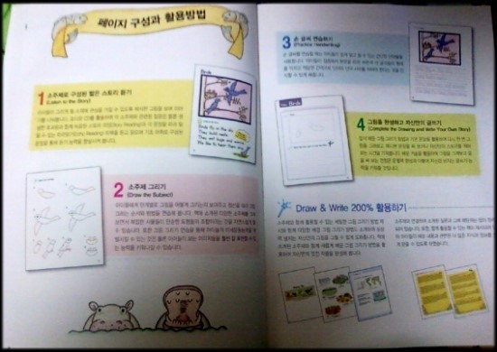 유치원에서 영어를 시작하면서 영어에 흥미를 갖고 영어를 좋아한답니다. 영어를 너무나 좋아하는 울 아들 아직까지 쓰는 것에는 관심을 보이지 않더라구요.. 어떻게 쓰기를 재미있고 즐겁게 접근시켜줄까? 고민을 하고 있던 차에 'Draw&Write' 라는 책을 접하게 되었답니다.'Draw&Write'는 영어글쓰기뿐만 아니라 그림을 잘 그리지 못하는 울 아들에게 그림을 그리는 방법까지 제시하고 있어서 그림그리기도 배울 수 있는 책이랍니다. 그림과 영어글씨기를 동시에 잡을 수 있는 책이랍니다.
