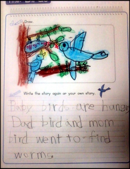 앞에서 배운 새 그림그리기 방법과 기본 문장을 활용해서 문장을 써보거나 자신만의 스토리를 적어보는 그림완성하고 자신만의 글쓰기(Complete the Drawing and Write Your Own Story)를 해보았답니다. 울 아들 우선 옆에 그림을 보면서 앞에서 배웠던 새그림 그리는 방법을 생각하면서 새를 그렸답니다. 아빠새, 엄마새도 그리고, 새집에 있는 아기새를 조그마하게 그렸답니다. 그리고 나서, 새들에게 꼭 필요한 나무를 그려주었답니다. 그래서 아기새집이 안전하게 나뭇가지 위에 있을 수 있게 해주었고, 앉아있는 엄마새가 떨어지지 않게 나뭇가지를 그려주었답니다. 울 아들 장난기가 발동해서 아기새 둥지에다 아기새들이 운다고 “삑삑삑...” 하고 적어주었답니다.^^ 그리고 나서 새와 나무 나뭇잎을 이쁘게 색칠해주었답니다. 아래 글을 뭐라고 쓸까? 하고 물었더니 울 아들 “아기 새들이 배가 고팠어요. 아빠새, 엄마새는 벌레를 찾으러 갔어요라고 적고 싶어.” 하고 말을 하네요. 제가 아이에게 문장을 적어 주고 안내선이 있는 빈칸에 적어보게 했다니다. 울 아들 엄마가 적은 문장을 보면서 안내선 안에 글을 썼답니다. 안내선 안에 글쓰기가 처음이라서 좀 힘들어했지만, 그래도 너무 즐겁고 재미있게 글쓰기를 했답니다. 삐뚤빼뚤 조금은 어설프지만, 처음 써본 문장치고는 정말 잘썼네요.. 열심히 한 울 아들에게 칭찬도 듬뿍해주었답니다. 짜잔~!! 울 아들이 처음으로 쓴 영문장 어때요?