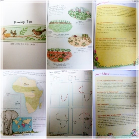 동물을 그리고 나서 각 파트별로 끝에 보면 Drawing Tip이라고 해서 소주제와 함께 활용할 수 있는 세밀한 그림그리기 방법과 다양한 배경그림 그리기 방법을 소개하여 상상력 넘치는 그림을 그릴 수 있게 도와준답니다. 육지동물 그리기에서는 다양한 나라의 땅의 모습 그려보기가 나오고, ‘Learn More!'에서는 육지동물 이야기에 대해 더 많은 지식과 정보를 알 수 있네요. 또한, 사바나동물 이야기에서는 세계의 사바나지역에 대한 정보와 함께 아프리카 지도 그리는 방법을 알려주고 있답니다. ‘Learn More!'에서는 사바나 동물에 대한 더 많은 지식과 궁금한 것들을 배워볼 수 있답니다.