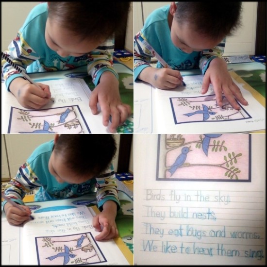 제시해 놓았답니다. 올바른 손글씨 연습을 위한 유의 사항은 한글을 쓸때도 참고하면 예쁜 손글씨 쓰기에 도움을 줄 것 같아요. 이제 본격적으로 아이와 함께 활용해 보았답니다. “여러 그림 중에서 어떤 걸 해볼까?” 하고 물었더니 울 아들 처음에 나온 새부터 해보자고 하네요. 'Birds'의 그림을 보더니 “아기 새들이 배가 고픈 가봐.. 그래서 아빠새가 먹이를 찾으러 가는 거지.. 엄마새는 아기 새를 돌봐야 해서 아빠새한테 먹이를 찾아오라고 말을 하고 있는 그림 같아.” 하고 말을 하네요.