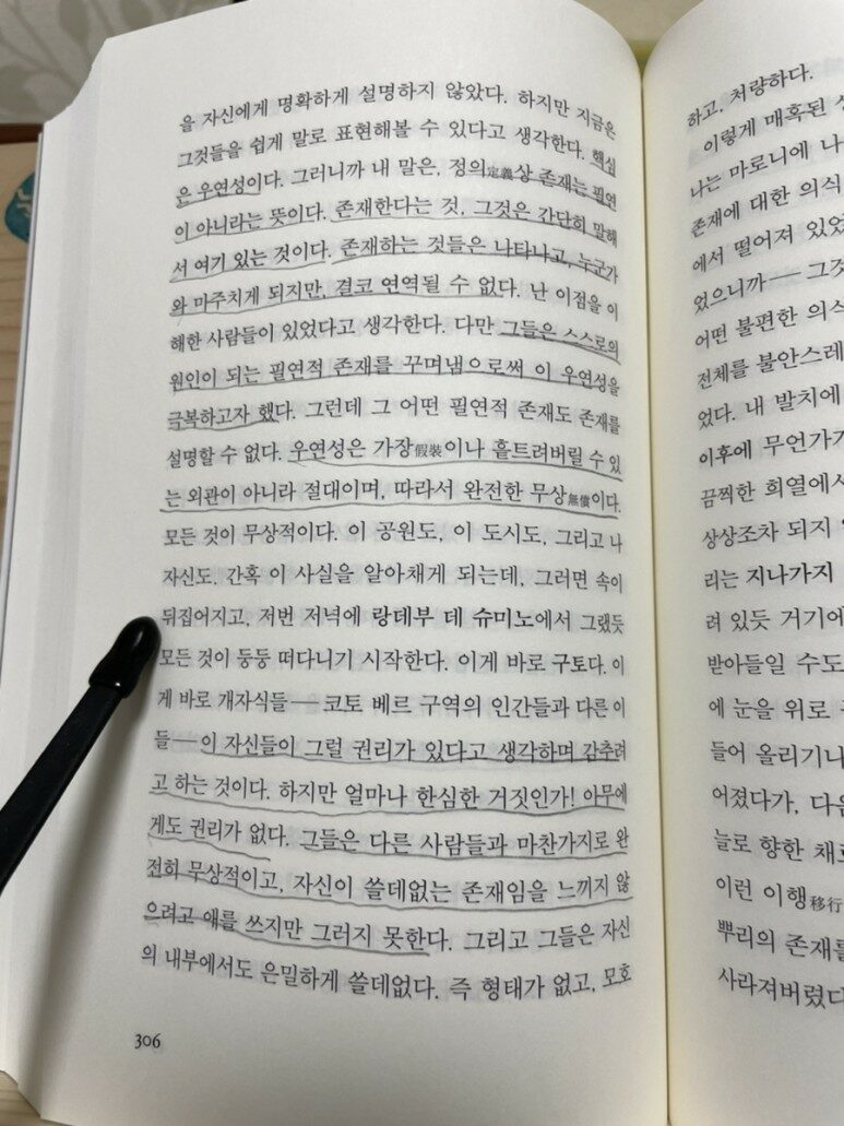 앙투안에게 존재는 자신뿐 아니라 주변 모든것에게도 해당되는데 그 존재의 상태를 항상 느끼는것도 아니다. 갑자기 강렬히 느꼈졌다가 사그라지듯이 느낌. 그 존재들이 강렬한데 다 쓸데 없다. 죽는것도 쓸데 없다. 그래서 그냥 살고 있기 때문에 그냥 살고 있는 것이다.