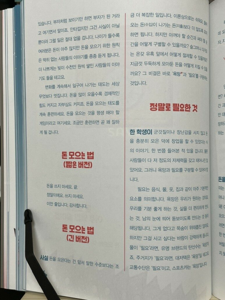 하지만 사람이 세상을 살려면 돈을 아예 안 쓸수가 없는데 그 때 사야하는 것을 결정하는 방법은 욕망과 필요를 구분해야한다는 것이다.