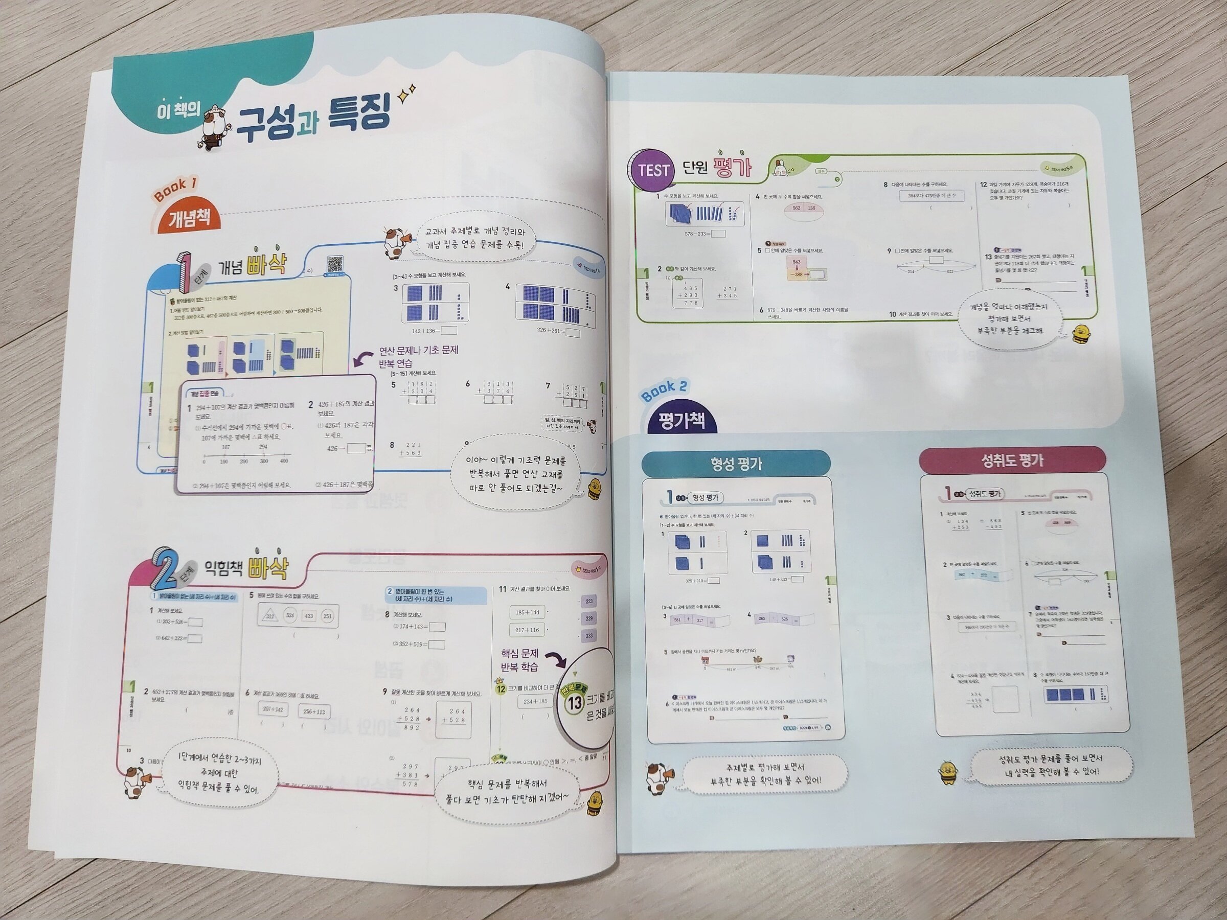 전에 다른 교재로 선행을 시도했는데 아이가 너무 어려워해 금방 포기했어요. 그래서 난이도 낮고 개념이 잘 잡힌 책을 찾다가 수학리더 개념을 선택했는데 선택이 정말 만족스럽습니다. 만화로 개념을 먼저 보여주고 풀이 과정도 단계별로 설명되어 있어서 스스로 읽고 이해하기 수월하더라고요. 소단원마다 개념 → 문제 → 단원평가 순서라 흐름이 안정적이에요. 개념 설명이 짧고 명확하며 문제 수도 적당해서 아이가 스스로 해결하는 비중이 늘었어요. 3학년 기초 다지기에 딱 좋습니다.