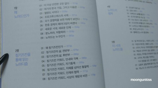 이 책에서는 노마드가 필요한 이유, 칭기즈칸에 대한 이야기, 노마드가 가지고 있는 행복, 이 시대의 노마드에 대한 이야기가 들어있다.