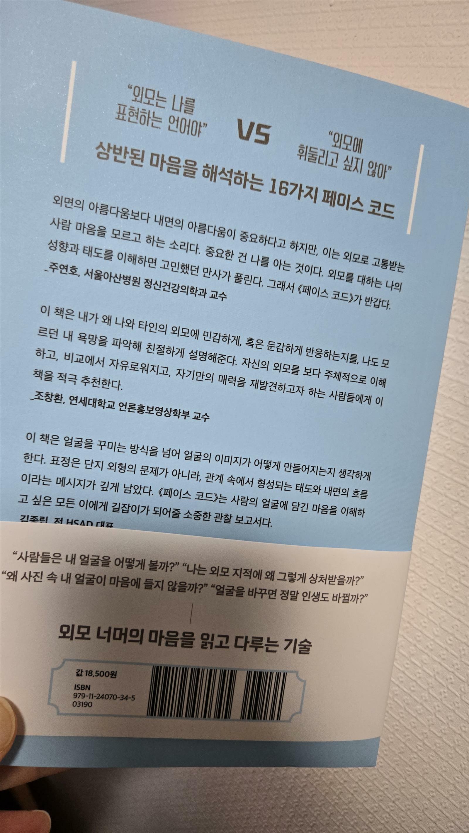 책은 우리가 거울 앞에 설 때 반복되는 심리적 반응을 ‘페이스 코드’라는 개념으로 정리합니다. 외모에 대한 반응을 결정짓는 네 가지 축—민감도, 가치관, 감정, 반응도—을 교차시켜 16가지 유형으로 분류한 이 지도는, 마치 외모판 MBTI처럼 정교합니다. ‘즐거운 관종(KUPA)’에서 ‘선택적 중립주의자(BONI)’에 이르기까지, 각자의 코드를 따라가다 보면 내가 왜 특정한 부위에 집착했는지, 왜 타인의 시선에 그토록 흔들렸는지가 선명하게 드러납니다.