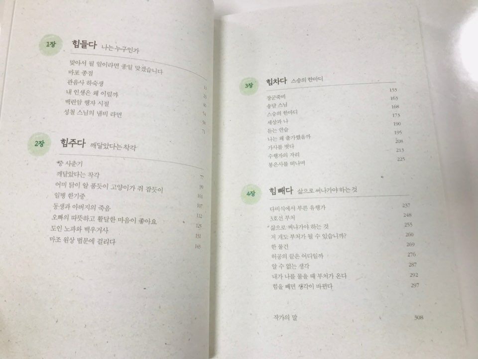 힘을 빼면 우리가 집착하고 욕망하는 것이 허망하다는 것을 알 수 있다. 절집에는 '인신난득이요, 불법난봉이다'라는 말이 있다. '사람 몸 받기 힘들고 부처님 법 만나기 힘들다'라는 뜻이다. 이생에 사람 몸 받고 더없이 수승한 부처님을 만났으니 부지런히 수행해 묶여 있는 모든 업력의 굴레에서 벗어나 생사가 끊어진 대자유, 해탈을 향해 한 걸음 나아갈 뿐이다. _ 책 중에서