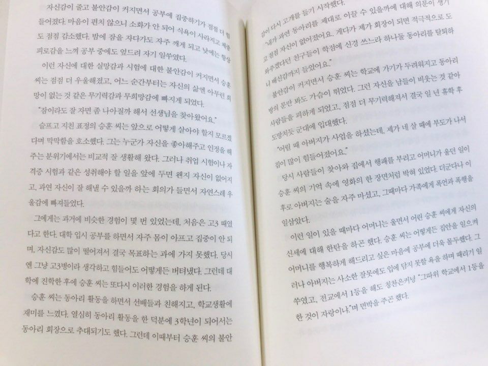 불안감이 커지면서 승훈씨는 학교에 가기가 두려워지고 동아리 방의 문만 봐도 가슴이 뛰었다. 그런 자신을 남들이 비웃는 것 같아 사람들을 피하게 되었고, 점점 더 무기력해져서 결국 일년 휴학 후 도망치듯 군대에 입대했다. - 중략 -