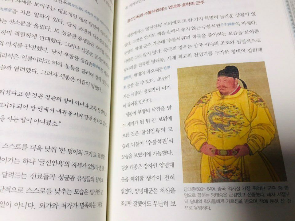 고금동서를 막론하고 최고통치권자를 비롯한 각 방면의 리더에게는 조직을 장악하고 조직원을 이끄는 탁월한 능력이 필요하다. 카리스마와 비전, 추진력, 네트워크 운용능력 등이 요구되는 이유다. 이는 대략 태종 이방원을 통해 확인할 수 있다. 그의 뒤를 이은 세종은 이런 능력과 동떨어져 있었다. 그는 국가 정책의 초점을 민리의 증진에 맞췄다. 이를 위해 성실한 마음으로 직무에 진념하는 모습을 보였다. 그의 치국평천하 리더십은 부왕인 태종과는 정반대였다. 태종이 단호한 결정과 강력한 추진력을 바탕으로 난세 리더십의 전형을 보여준 데 반해 세종은 부드럽고 포용적인 정책결정 과정과 모든 사람과 소통하는 자세로 치세 리더십의 전형에 가까웠다. _ 세종 편 중에서