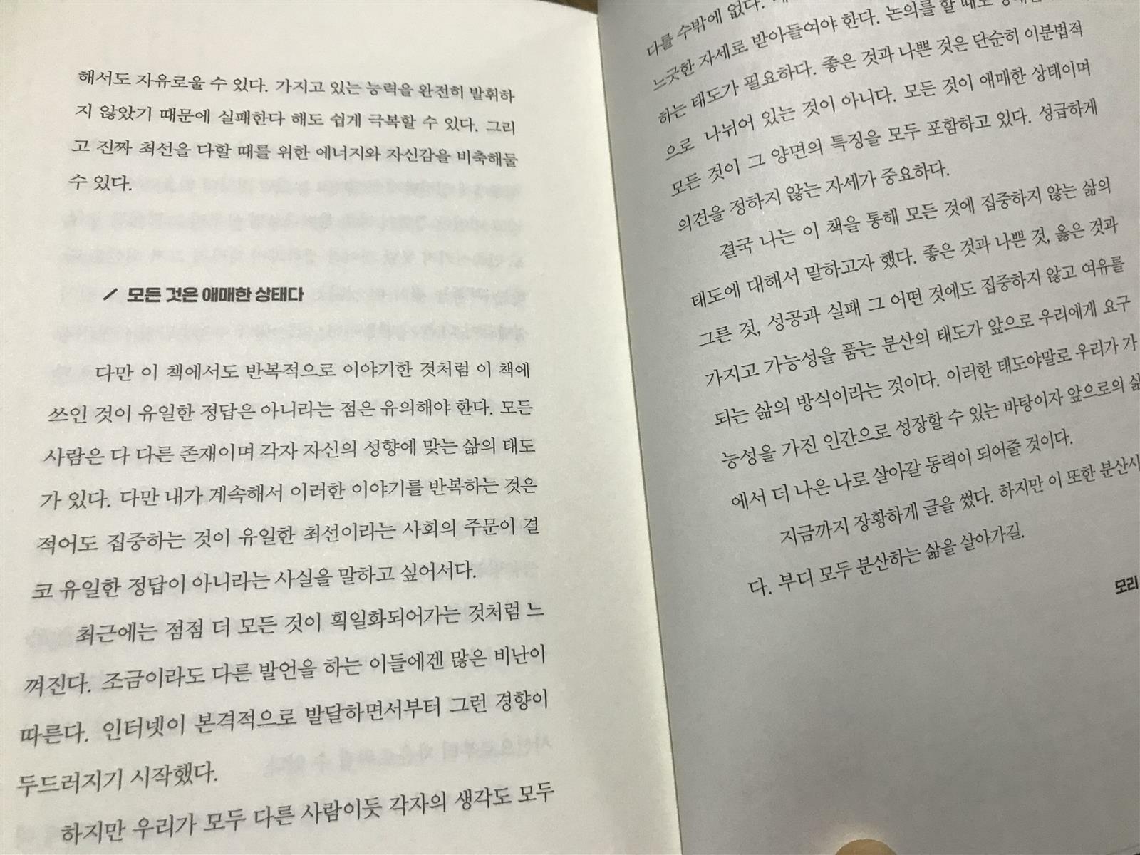 결국 나는 이 책을 통해 모든 것에 집중하지 않는 삶의 태도에 대해서 말하고자 했다. 좋은 것과 나쁜 것, 옳은 것과 그른 것, 성공과 실패 그 어떤 것에도 집중하지 않고 여유를 가지고 가능성을 품는 분산의 태도가 앞으로 우리에게 요구되는 삶의 방식이라는 것이다. 이러한 태도야말로 우리가 가능성을 가진 인간으로 성장할 수 있는 바탕이자 앞으로의 삶에 더 나은 나로 살아갈 동력이 되어줄 것이다.