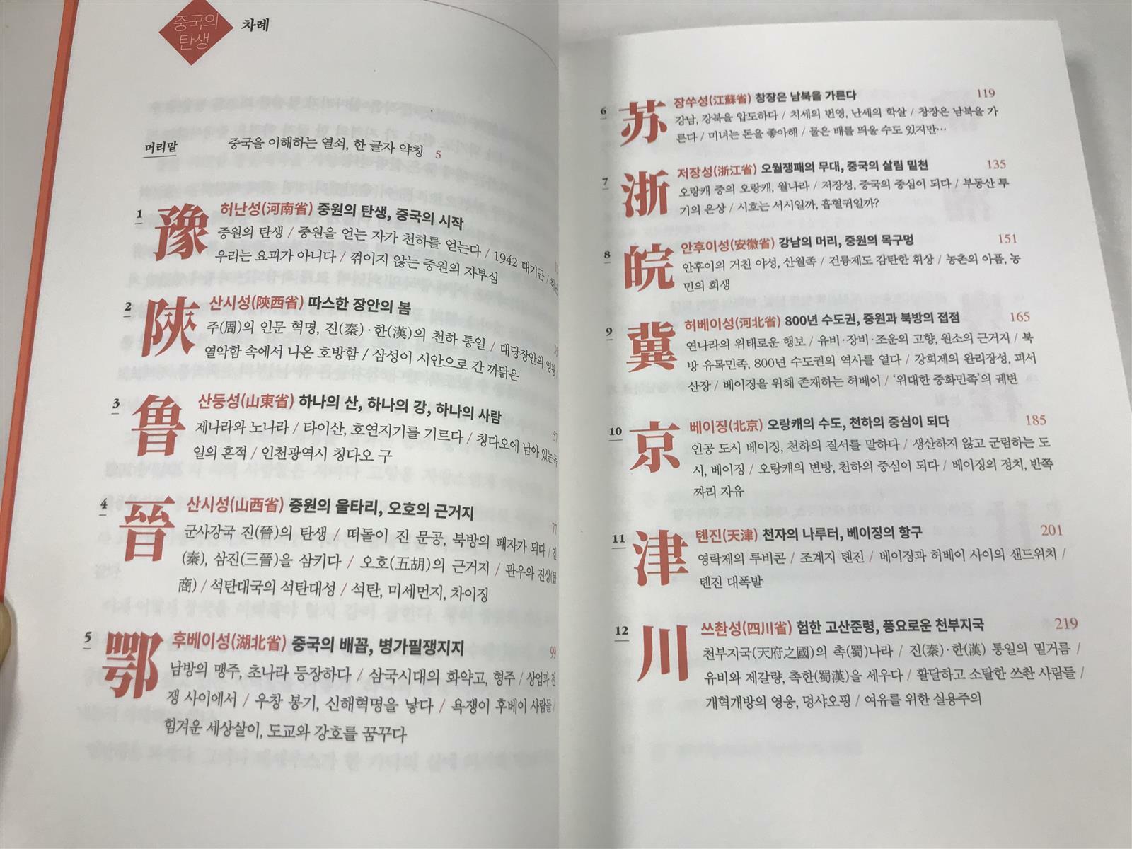 이 책은 크게 두 부분으로 나누어 출간했다. 1권 격에 해당하는 '중국의 탄생' 편은 황허 중류의 작은 마을이 어떻게 큰 나라로 성장해 중원이 되었는지 살펴보는 순서로 구성했다. 2권 격에 해당하는 '중국의 확장'에서는 유목민족의 정복제국을 거쳐 중국의 외연이 크게 확장되는 과정에 있었던 지역들을 살펴볼 것이다. 책의 구성은 역사적 의미를 따랐지만, 역사적 교양뿐만 아니라 중국인들의 마음과 문화, 오늘날 중국 각 지역의 가장 첨예한 문제까지 들여다볼 수 있도록 했다. 독자들은 역사서부터 문학작품, 경제보고서까지 두루 망라한 입체적인 중국을 만날 수 있을 것이다. _7쪽 머리말