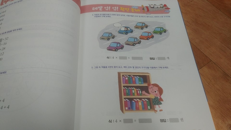 중간 중간 구구단을 이용한 곱셈으로 간단하게 풀 수 있는 문장제가 있다.