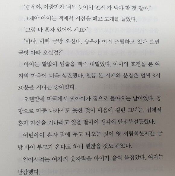 아이를 돌보는 여자는 오랜만에 미국에서 돌아온 딸 때문에라도 늦은 퇴근시간을 조금이라도 앞당기고 싶다.
