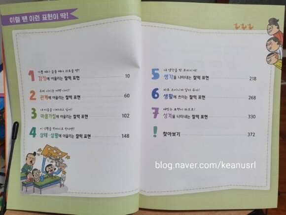 이렇게 7가지의 큰 주제의 상황 속에서 쓸 수 있는 찰떡 표현을 담아놓았다.