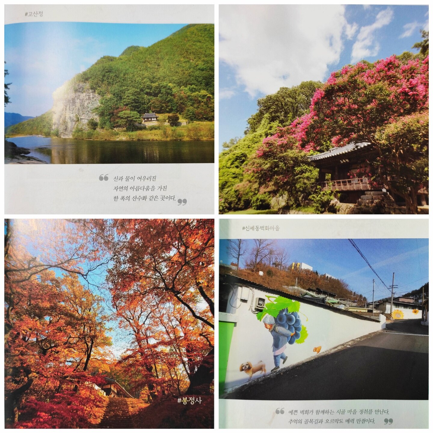 무엇이든 아는 것만큼 보이는 것처럼 여행도 단순히 눈으로 즐기는 것을 넘어 장소의 의미와 역사 그리고 여행의 목적을 미리 생각하고 계획한다면 더 깊이 있고 기억에 남는 여행이 될 것이다. 5월초 안동에 들러 안동찜닭으로 점심식사 후 맘모스 제과점의 크림치즈 빵을 사서 처음으로 봉정사를 방문해 그곳이 유네스코 세계문화유산으로 등재된 곳임을 알았다. 녹음의 봉정사도 좋았지만 책 속 사진처럼 단풍과 함께 할 수 있는 가을의 봉정사가 더 운치 있을 것 같다. 안동에 대한 깊은 애정과 관심 그리고 그런 안동의 매력을 많은 이들에게 알리고자 하는 작가의 애정이 듬뿍 담긴 『사계절, 언제나 안동』을 가지고 다음엔 더 의미있고 계획된 안동 여행을 할 수 있을 것 같아 기대된다.