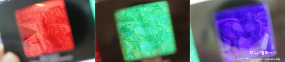 저희집 1호가 빨간색, 초록색, 파란색 렌즈를 통해 문화의 하이라이트를 살펴보고 있어요.