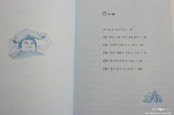 약 150 페이지 분량으로 5장으로 나뉘어져 0세부터 4단계로 책을 사랑하는 방법을 알려주어요.
