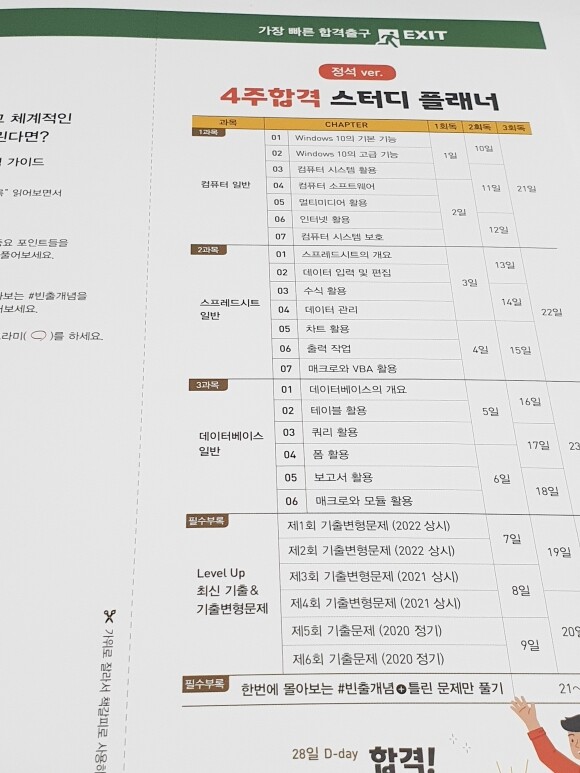 스터디 플래너는 별거 아니라고 생각할 수 있다. 하지만 그 것은 오산이다. 컴퓨터활용능력이 오랫동안 중요한 자격증으로 자리매김한 만큼 대비할 수 있는 콘텐츠도 다양해졌다. 중요한 것은 수험자의 마음 아닐까 싶다. 스터디 플래너를 통해서 시간 관리를 잘 할 수 있다면 에듀윌 컴활 1급 필기로 충분히 독학이 가능하다. 그 만큼 알차고 효율적인 학습이 가능한 이 책의 장점을 조금 더 소개 하겠다.