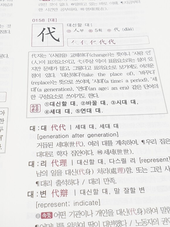 최근 문해력 향상에 관한 관심이 많이 있다. 결국 배경지식을 어떻게 탄탄하게 형성하느냐가 중요한 요소가 아닐까 싶다. <선생님 한자책>은 한자에 대응되는 영 단어를 제공한다. 한자 뿐만 아니라 영어에 대해서도 한 번에 학습할 수 있기 때문에 매우 도움이 되고 효율적이다.