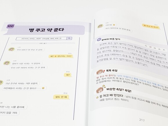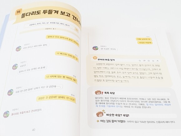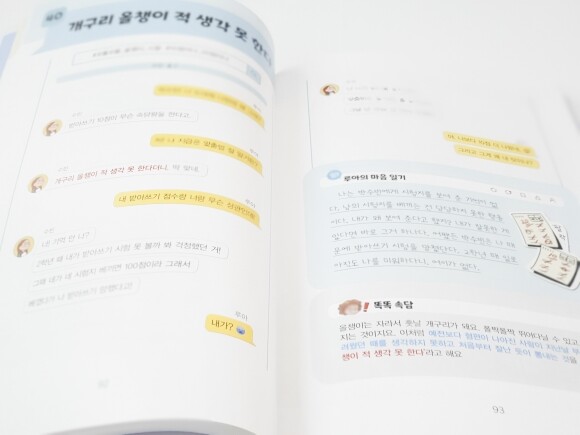 그런면에서 <요즘 어린이 속담>은 아이들에게 정말 도움이 많이 될 것 같다. 가장 큰 특징이자 장점은 속담에 이야기를 더해서 흥미롭게 구성했다는 점이다. 거기에 카톡 대화 상황을 통해서 속담을 이해할 수 있기 때문에 친근하게 접할 수 있다.