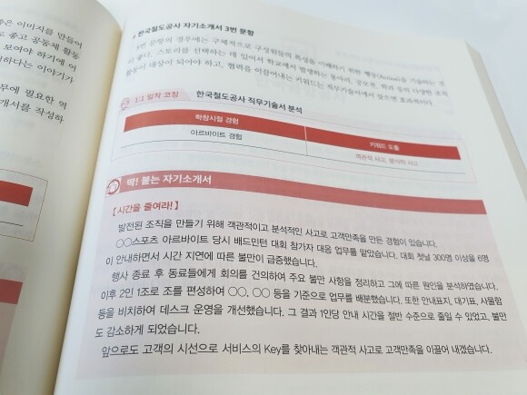다양한 공사, 공기업에 대한 맞춤 사례를 제시해주기 때문에 이해가 쏙 되고 어떤 흐름혹은 형태로 작성해야 하는지 알 수 있었다. 그냥 이론만 나열 되어 있다면 지루할 수도 있고 이걸 굳이 왜 봐야 하나? 하는 생각이 들 수도 있는데 역시 사례 중심인 것이 집중도를 높이고 크게 와닿는 요인이었다. 또, 다양한 사례를 통해 응용하고 다각화된 시선을 어느 정도 느껴볼 수 있다는 점도 큰 장점인 것 같다. 어쨌든 공기업자기소개서 작성법을 마스터해야 면접으로 향할 수 있기에 이 사례들을 잘 공부하고 나만의 자기소개서 전략을 세워서 준비한다면 좋은 결과 있지 않을까 싶다.