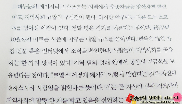 위의 내용처럼 야구 팬들 이야기가 절반이라면 남은 절반은 야구용어에 대해 풀어 설명하고 있어요.